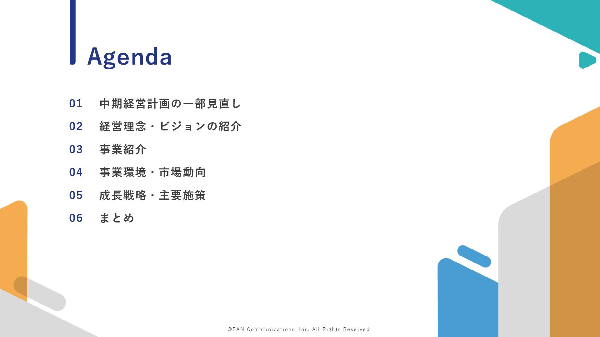 ©FAN Communications, Inc. All Rights Reserved 01 中期経営計画の一部見直し 02 経営理念・ビジョンの紹介