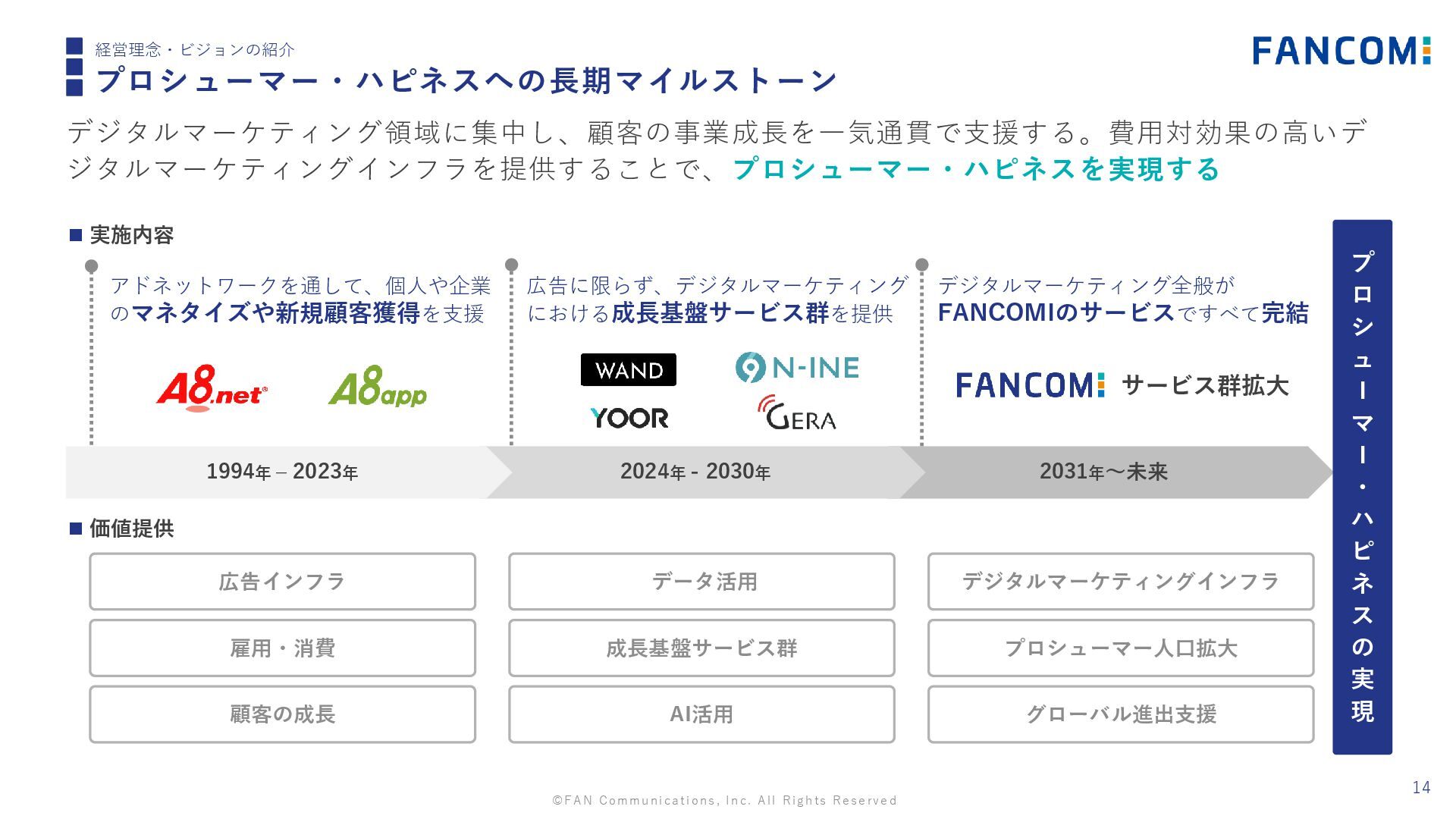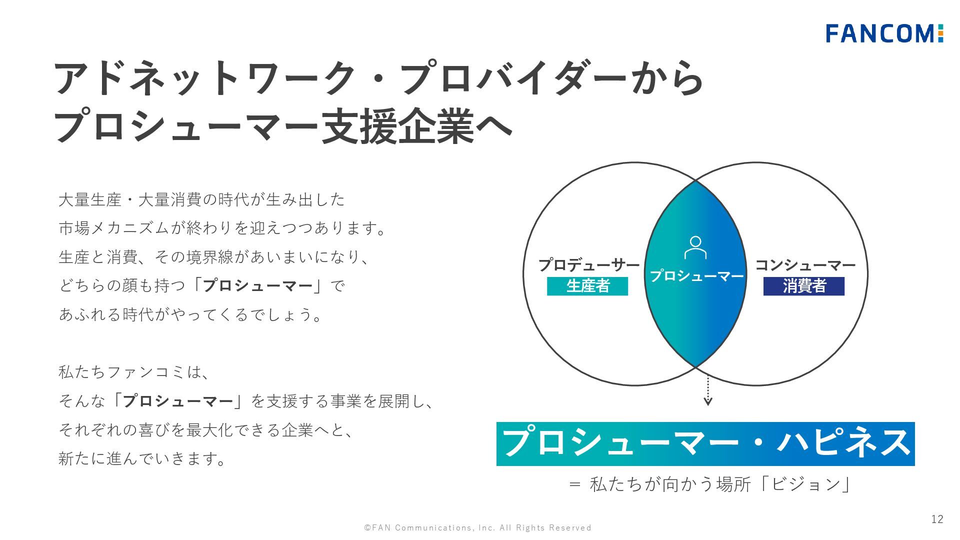 プロシューマー・ハピネス プロデューサー 生産者 コンシューマー 消費者 プロシューマー = 私たちが向かう場所「ビジョン」 アドネットワーク・プロバイダーから プロシューマー支援企業へ ©FAN Communications, Inc. All Rights Reserved