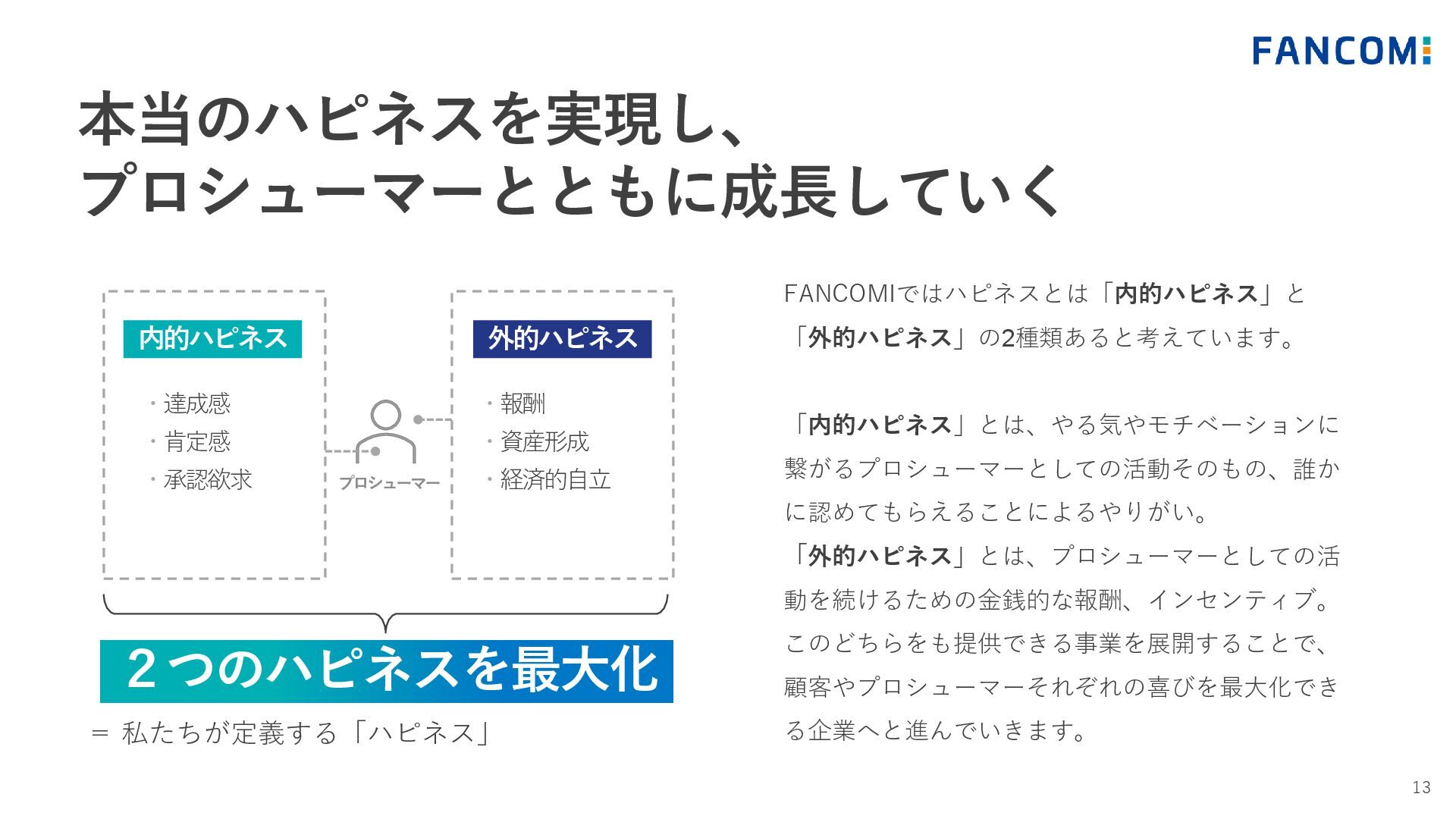 外的ハピネス FANCOMIではハピネスとは「内的ハピネス」と 「外的ハピネス」の2種類あると考えています。 「内的ハピネス」とは、やる気やモチベーションに 繋がるプロシューマーとしての活動そのもの、誰か に認めてもらえることによるやりがい。 「外的ハピネス」とは、プロシューマーとしての活 動を続けるための金銭的な報酬、インセンティブ。 このどちらをも提供できる事業を展開することで、 顧客やプロシューマーそれぞれの喜びを最大化でき る企業へと進んでいきます。 ・報酬 ・資産形成 ・経済的自立 プロシューマー