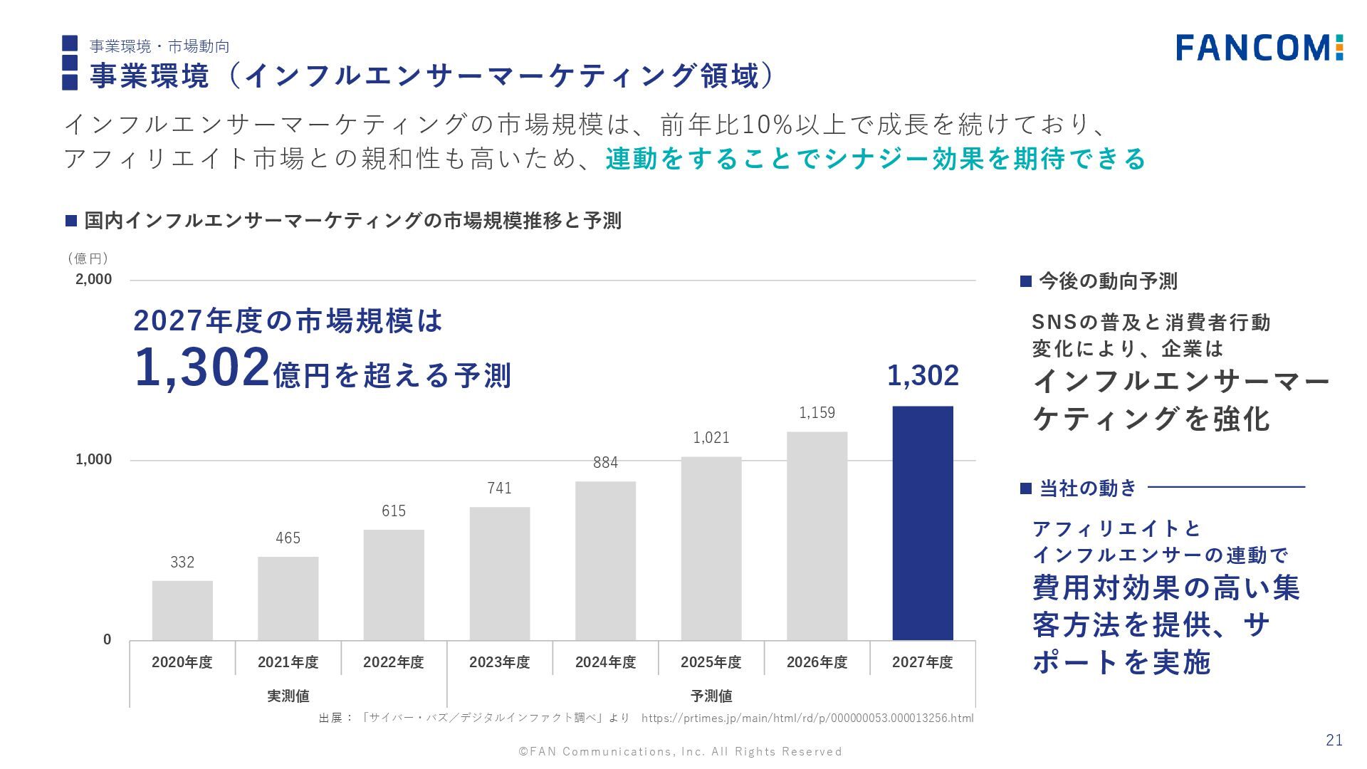 4,448 4,865 5,331 5,862 0 4,000 8,000 2020年度 2021年度 2022年度 2023年度 2024年度 2025年度 2026年度 2027年度 実測値 予測値 20 事業環境・市場動向 事業環境(アフィリエイト領域) インターネット広告市場は今後も成長し続ける見込みであり、 当社が展開するアフィリエイトネットワーク事業の追い風となることが見込まれる (億円) 2027年度の市場規模は 5,860億円を超える予測 出展:「アフィリエイト市場に関する調査を実施(2024年)」(株式会社矢野経済研究所)より https://www.yano.co.jp/press-release/show/press_id/3523 若い世代の参入の 増加が見込まれる インフルエンサーを 取り込み拡大を狙う ◼ 当社の動き ◼ 今後の動向予測 ◼ 国内アフィリエイト市場規模推移と予測 SNSを中心とする 業界最大の登録者数の A8.netを中心に