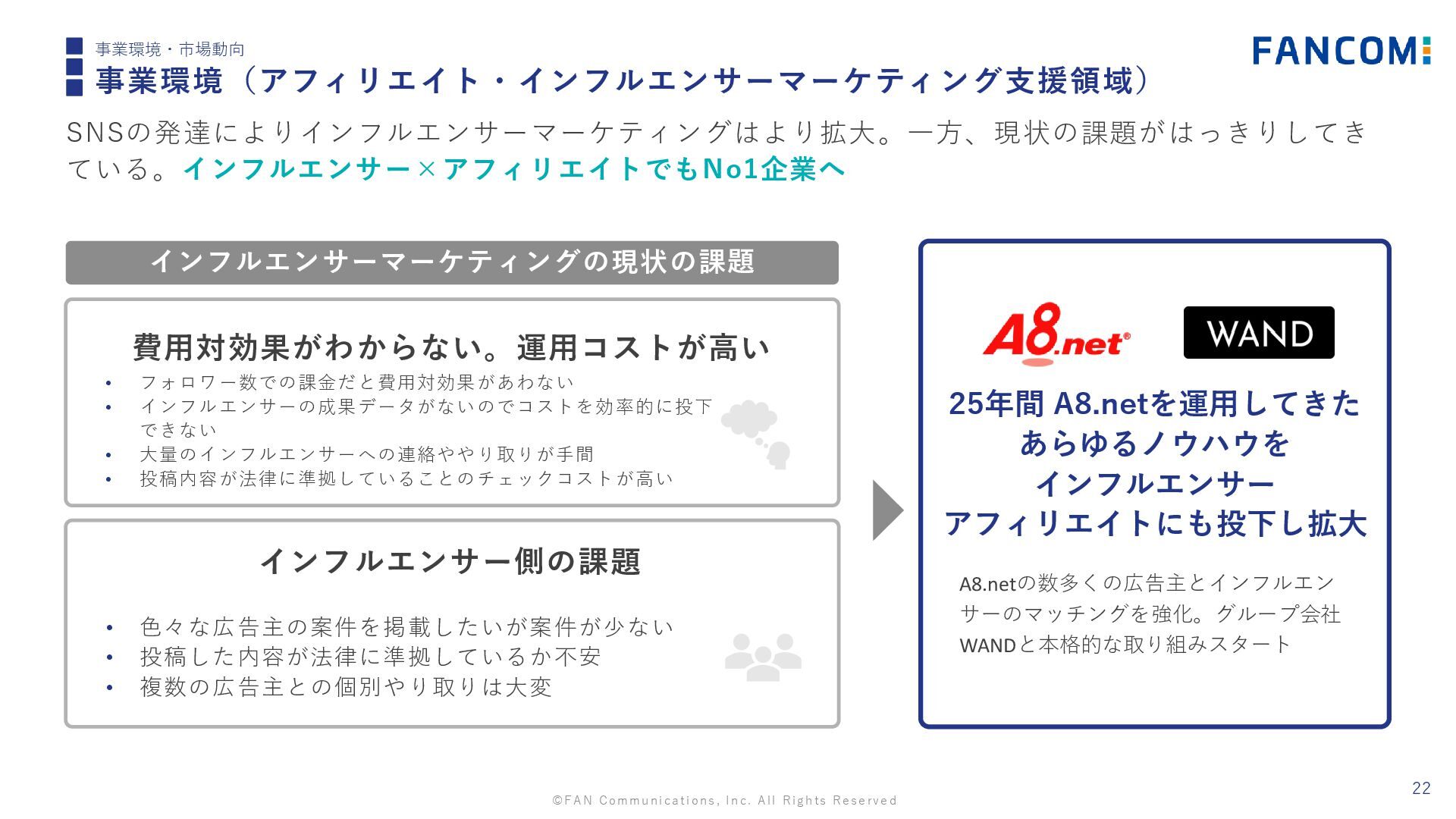 ている。インフルエンサー×アフィリエイトでもNo1企業へ 費用対効果がわからない。運用コストが高い • フォロワー数での課金だと費用対効果があわない • インフルエンサーの成果データがないのでコストを効率的に投下 できない • 大量のインフルエンサーへの連絡ややり取りが手間 • 投稿内容が法律に準拠していることのチェックコストが高い 25年間 A8.netを運用してきた あらゆるノウハウを インフルエンサー アフィリエイトにも投下し拡大 A8.netの数多くの広告主とインフルエン サーのマッチングを強化。グループ会社 WANDと本格的な取り組みスタート • 色々な広告主の案件を掲載したいが案件が少ない • 投稿した内容が法律に準拠しているか不安 • 複数の広告主との個別やり取りは大変 インフルエンサーマーケティングの現状の課題 インフルエンサー側の課題