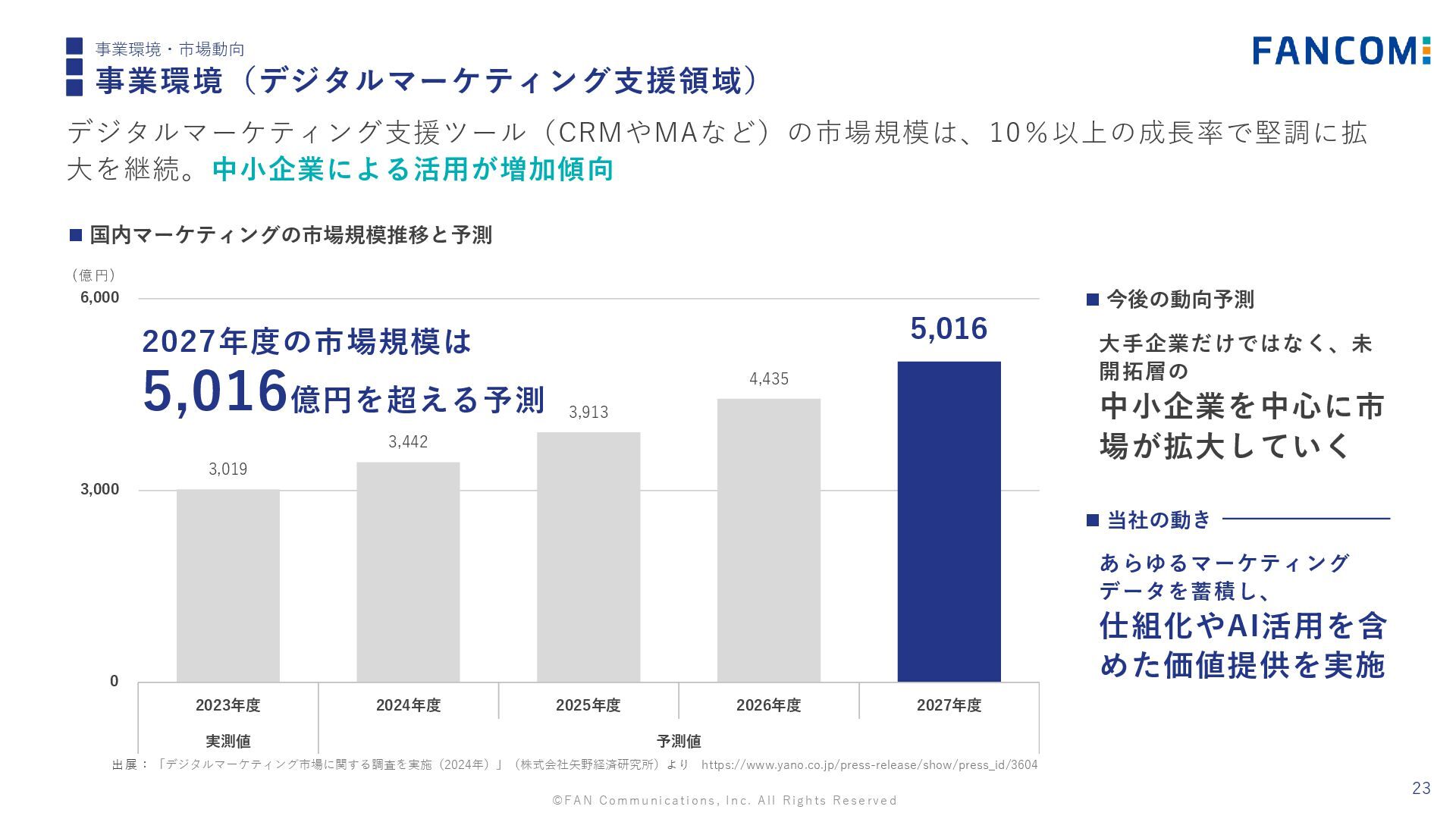 5,016 0 3,000 6,000 2023年度 2024年度 2025年度 2026年度 2027年度 実測値 予測値 23 事業環境・市場動向 事業環境(デジタルマーケティング支援領域) デジタルマーケティング支援ツール(CRMやMAなど)の市場規模は、10%以上の成長率で堅調に拡 大を継続。中小企業による活用が増加傾向 2027年度の市場規模は 5,016億円を超える予測 ◼ 国内マーケティングの市場規模推移と予測 中小企業を中心に市 場が拡大していく 仕組化やAI活用を含 めた価値提供を実施 ◼ 今後の動向予測 大手企業だけではなく、未 開拓層の あらゆるマーケティング データを蓄積し、 ◼ 当社の動き (億円) 出展:「デジタルマーケティング市場に関する調査を実施(2024年)」(株式会社矢野経済研究所)より https://www.yano.co.jp/press-release/show/press_id/3604
