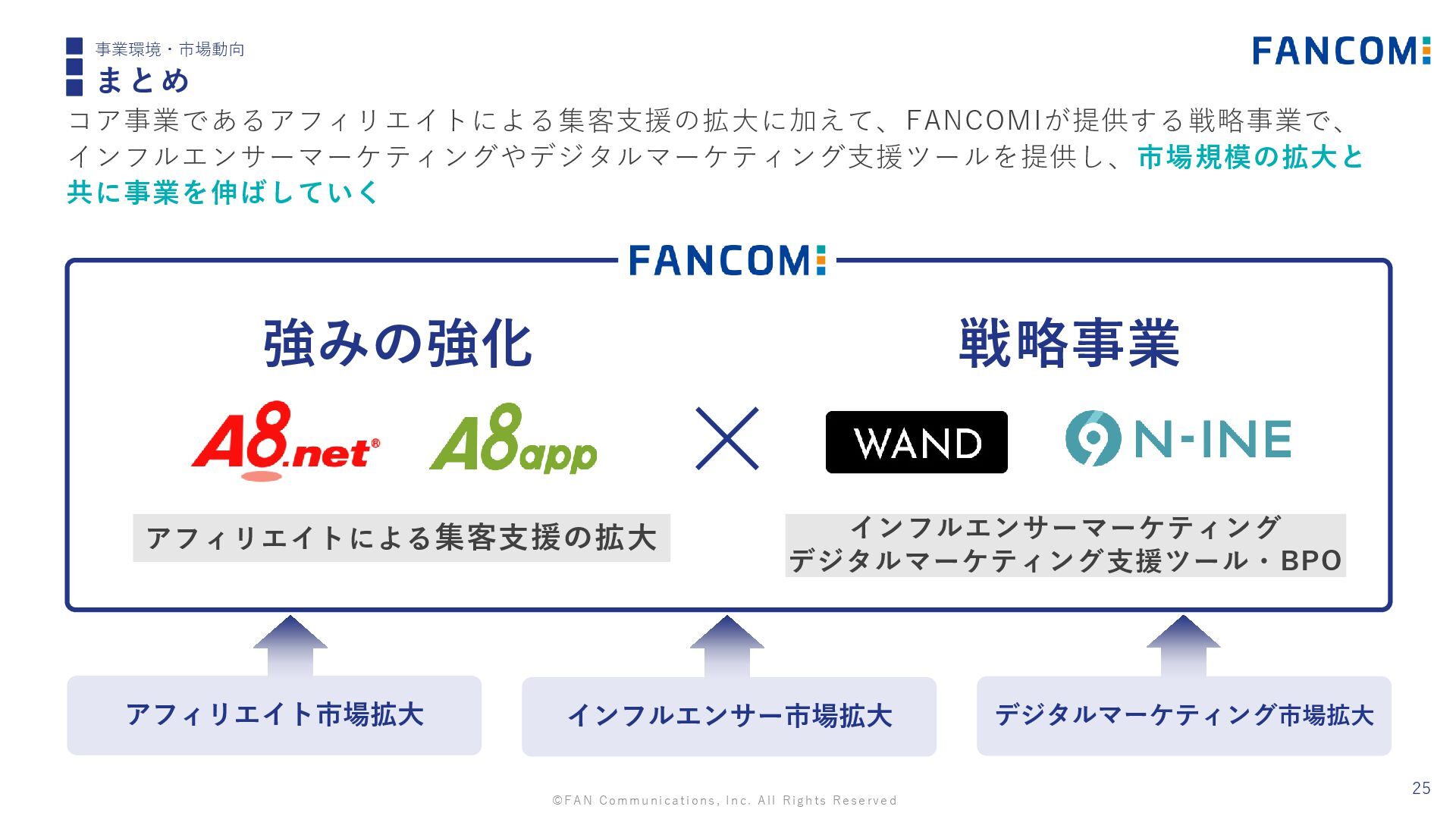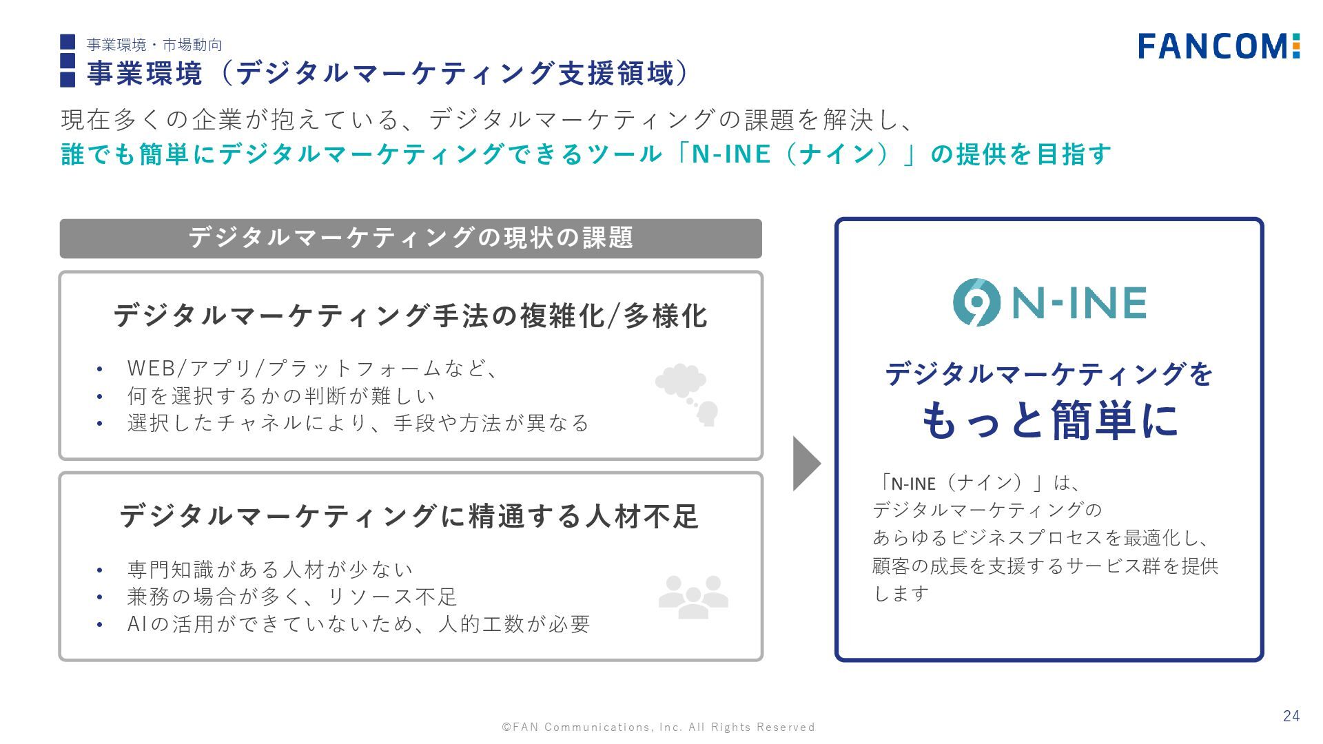 ©FAN Communications, Inc. All Rights Reserved 24 事業環境・市場動向 事業環境(デジタルマーケティング支援領域) 現在多くの企業が抱えている、デジタルマーケティングの課題を解決し、