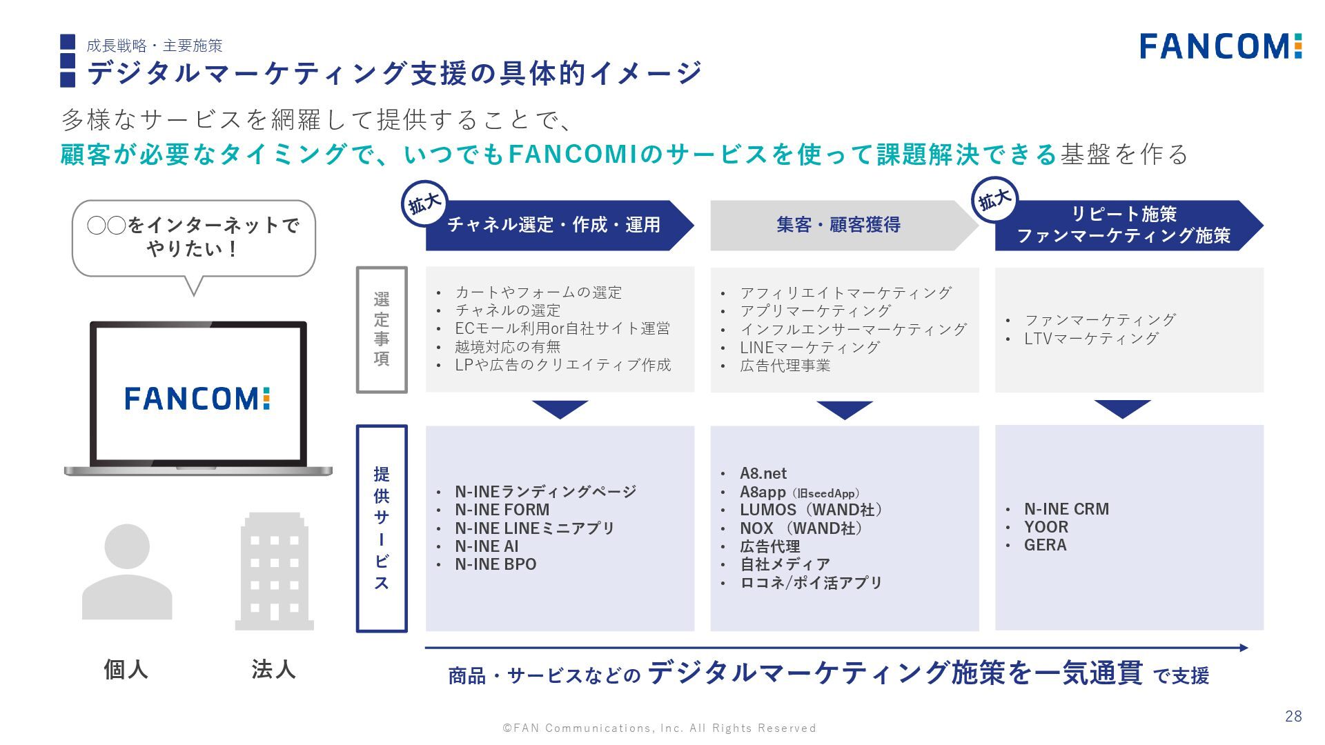 顧客が必要なタイミングで、いつでもFANCOMIのサービスを使って課題解決できる基盤を作る ◯◯をインターネットで やりたい! 選 定 事 項 提 供 サ I ビ ス リピート施策 ファンマーケティング施策 集客・顧客獲得 チャネル選定・作成・運用 • カートやフォームの選定 • チャネルの選定 • ECモール利用or自社サイト運営 • 越境対応の有無 • LPや広告のクリエイティブ作成 • N-INEランディングページ • N-INE FORM • N-INE LINEミニアプリ • N-INE AI • N-INE BPO • アフィリエイトマーケティング • アプリマーケティング • インフルエンサーマーケティング • LINEマーケティング • 広告代理事業 • ファンマーケティング • LTVマーケティング • A8.net • A8app(旧seedApp) • LUMOS(WAND社) • NOX (WAND社) • 広告代理 • 自社メディア • ロコネ/ポイ活アプリ • N-INE CRM • YOOR • GERA 商品・サービスなどの デジタルマーケティング施策を一気通貫 で支援 個人 法人