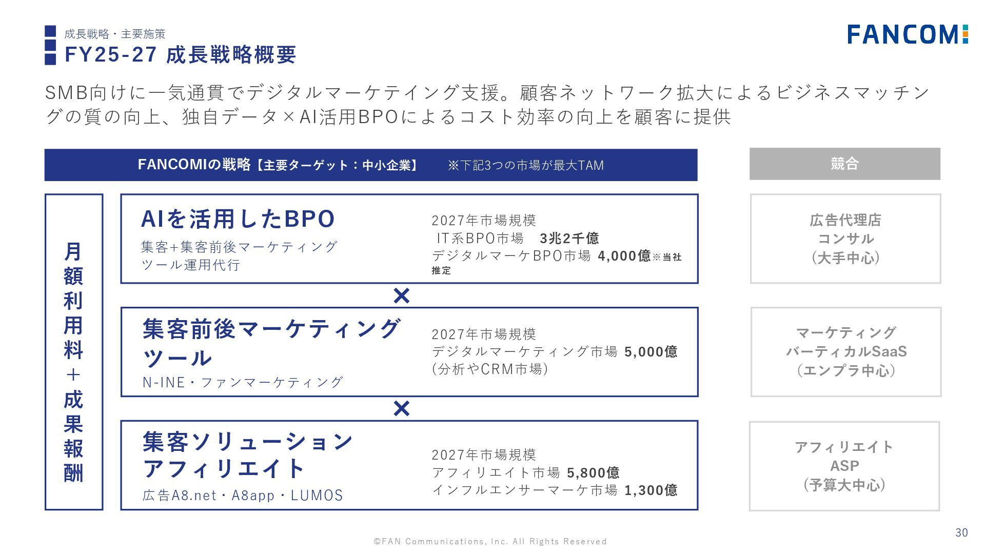 SMB向けに一気通貫でデジタルマーケテイング支援。顧客ネットワーク拡大によるビジネスマッチン グの質の向上、独自データ×AI活用BPOによるコスト効率の向上を顧客に提供 月 額 利 用 料 + 成 果 報 酬 AIを活用したBPO 集客+集客前後マーケティング ツール運用代行 2027年市場規模 IT系BPO市場 3兆2千億 デジタルマーケBPO市場 4,000億※当社 推定 集客前後マーケティング ツール N-INE・ファンマーケティング 2027年市場規模 デジタルマーケティング市場 5,000億 (分析やCRM市場) 集客ソリューション アフィリエイト 広告A8.net・A8app・LUMOS 2027年市場規模 アフィリエイト市場 5,800億 インフルエンサーマーケ市場 1,300億 広告代理店 コンサル (大手中心) マーケティング バーティカルSaaS (エンプラ中心) アフィリエイト ASP (予算大中心) FANCOMIの戦略【主要ターゲット:中小企業】 ※下記3つの市場が最大TAM 競合