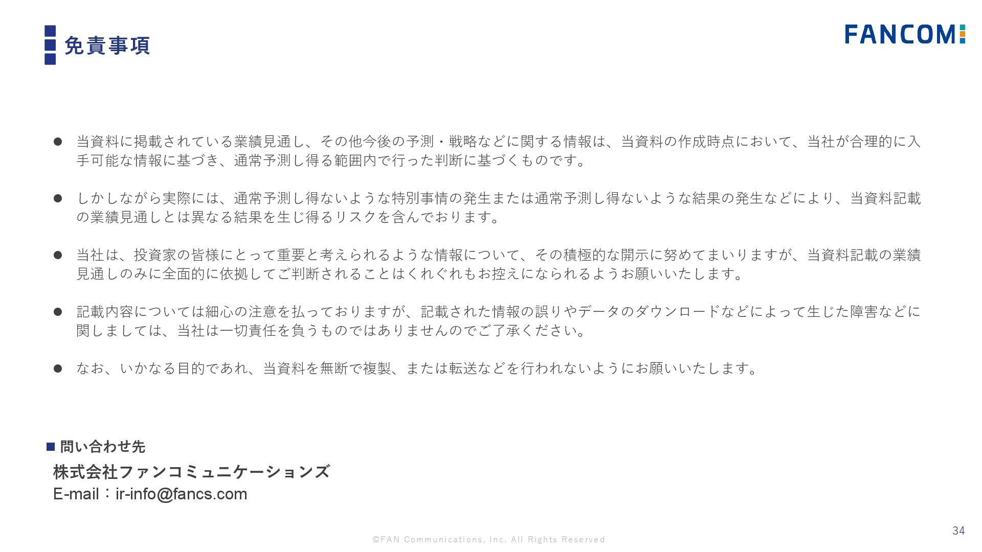 ©FAN Communications, Inc. All Rights Reserved 免責事項 34 ⚫ 当資料に掲載されている業績見通し、その他今後の予測・戦略などに関する情報は、当資料の作成時点において、当社が合理的に入