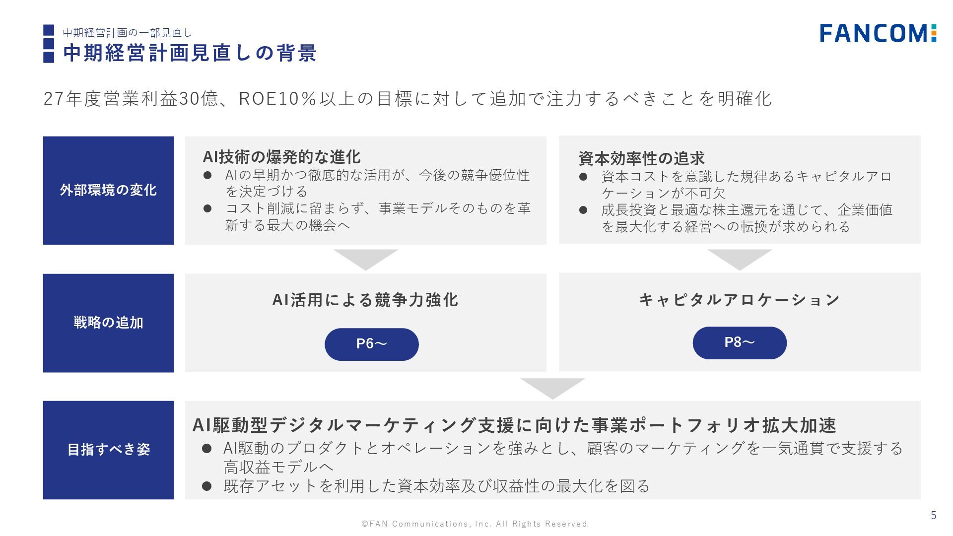 外部環境の変化 戦略の追加 目指すべき姿 ⚫ AI駆動のプロダクトとオペレーションを強みとし、顧客のマーケティングを一気通貫で支援する 高収益モデルへ ⚫ 既存アセットを利用した資本効率及び収益性の最大化を図る AI駆動型デジタルマーケティング支援に向けた事業ポートフォリオ拡大加速 AI活用による競争力強化 キャピタルアロケーション P6~ P8~ AI技術の爆発的な進化 ⚫ AIの早期かつ徹底的な活用が、今後の競争優位性 を決定づける ⚫ コスト削減に留まらず、事業モデルそのものを革 新する最大の機会へ 資本効率性の追求 ⚫ 資本コストを意識した規律あるキャピタルアロ ケーションが不可欠 ⚫ 成長投資と最適な株主還元を通じて、企業価値 を最大化する経営への転換が求められる