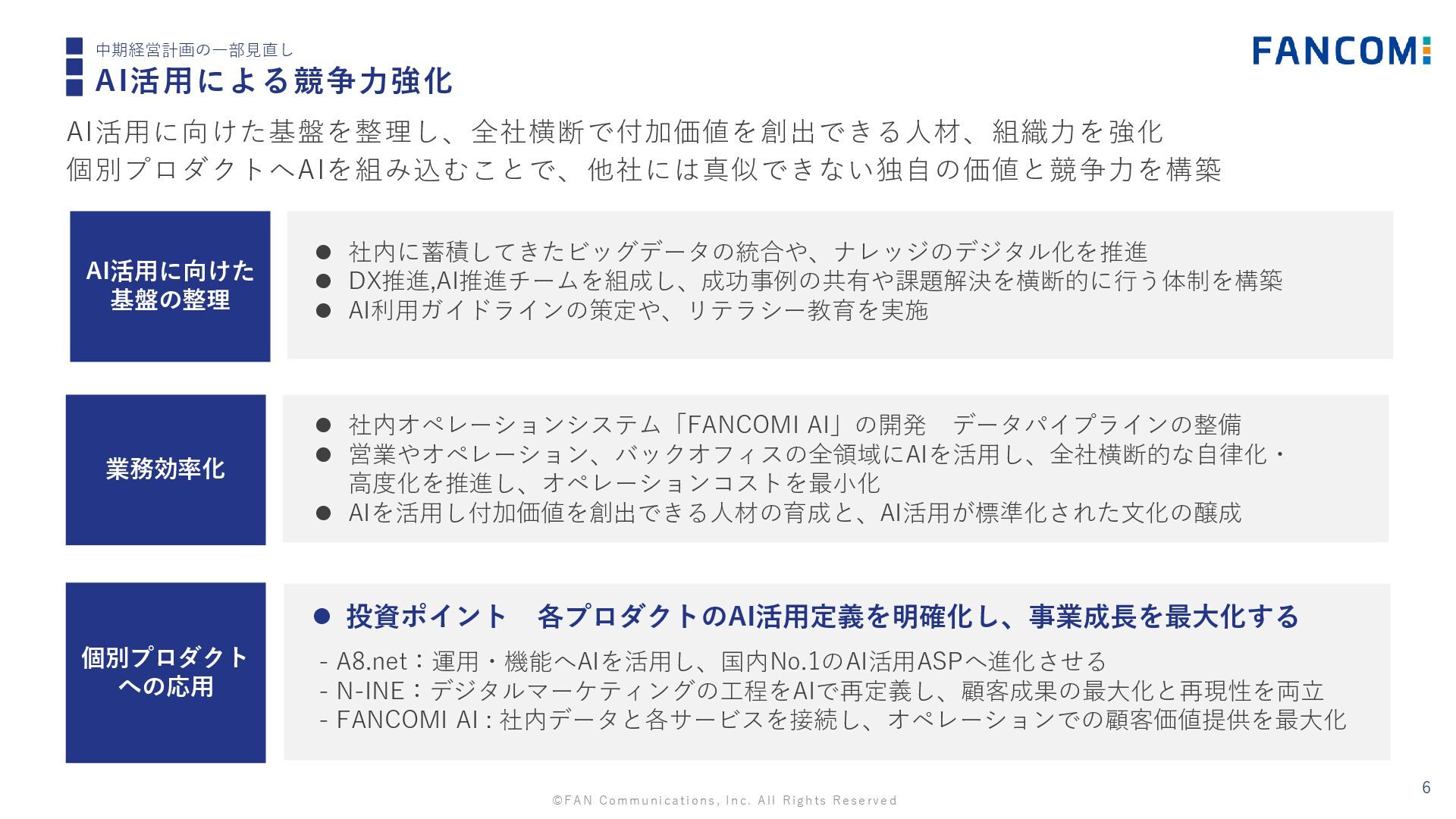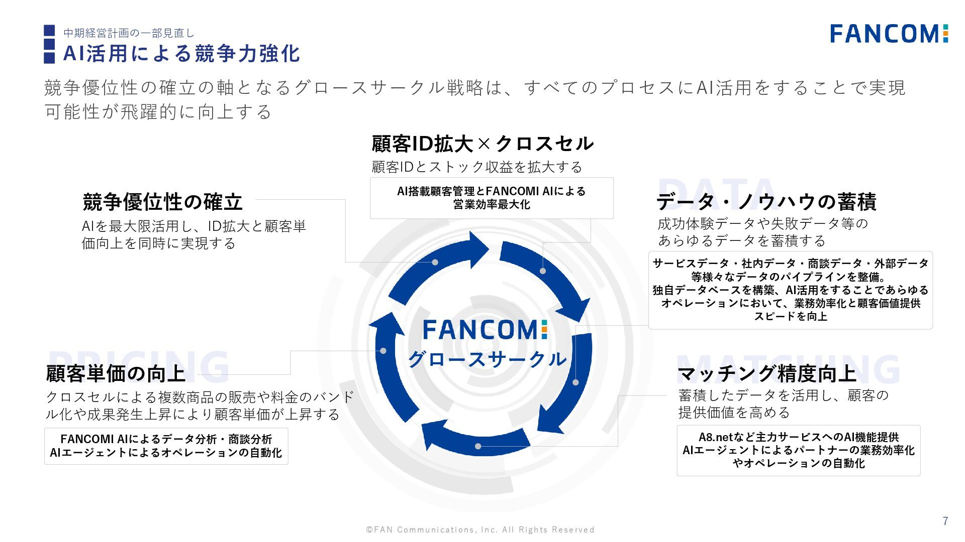 ©FAN Communications, Inc. All Rights Reserved 6 中期経営計画の一部見直し AI活用による競争力強化 AI活用に向けた基盤を整理し、全社横断で付加価値を創出できる人材、組織力を強化