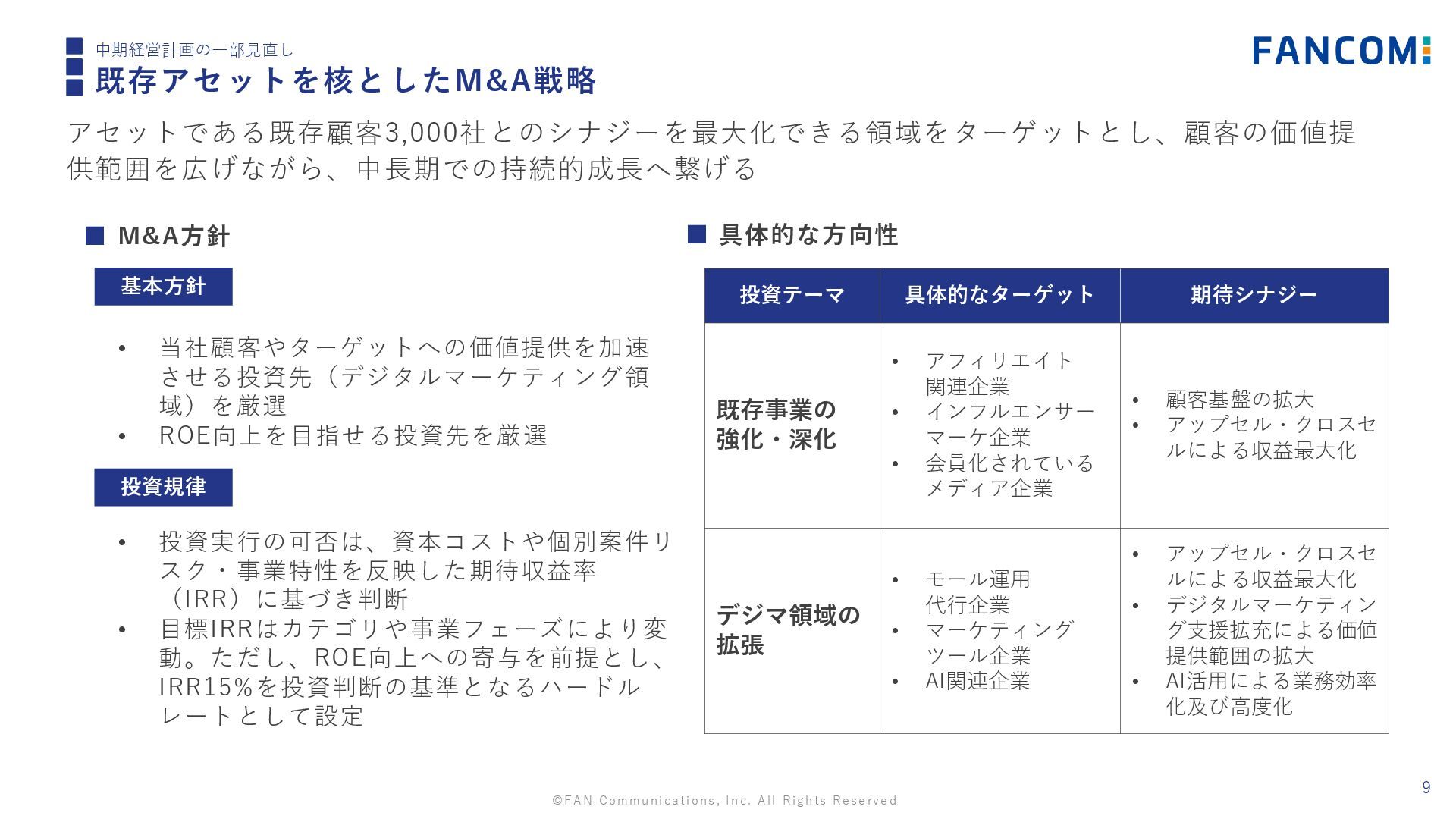 ©FAN Communications, Inc. All Rights Reserved 9 中期経営計画の一部見直し 既存アセットを核としたM&A戦略 アセットである既存顧客3,000社とのシナジーを最大化できる領域をターゲットとし、顧客の価値提