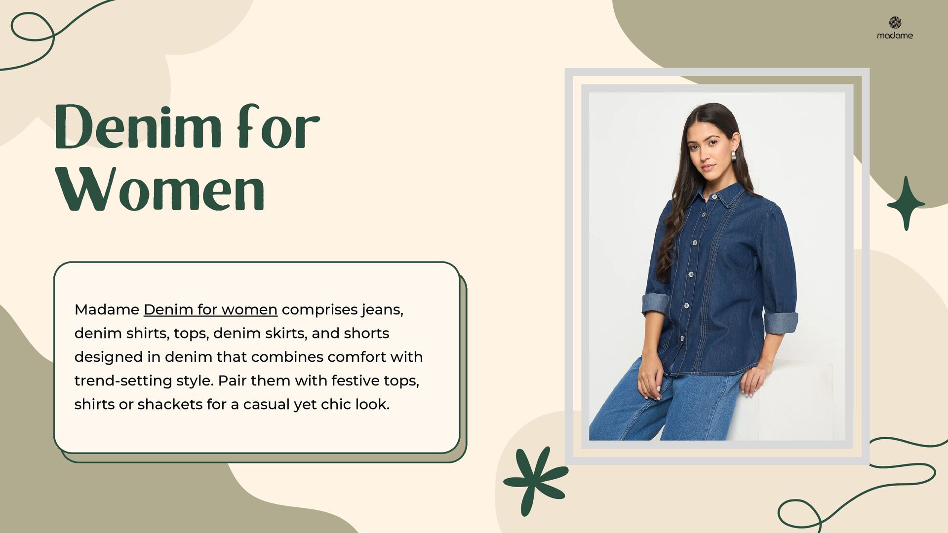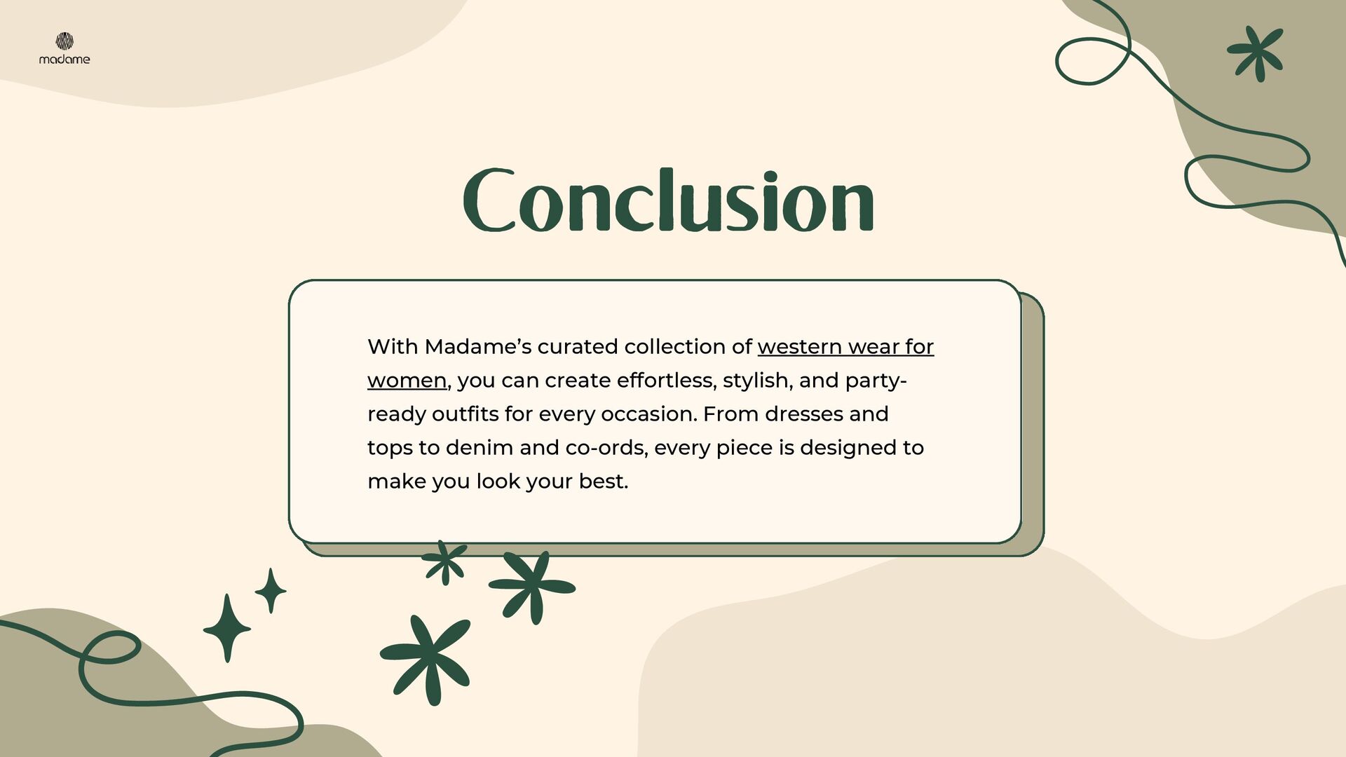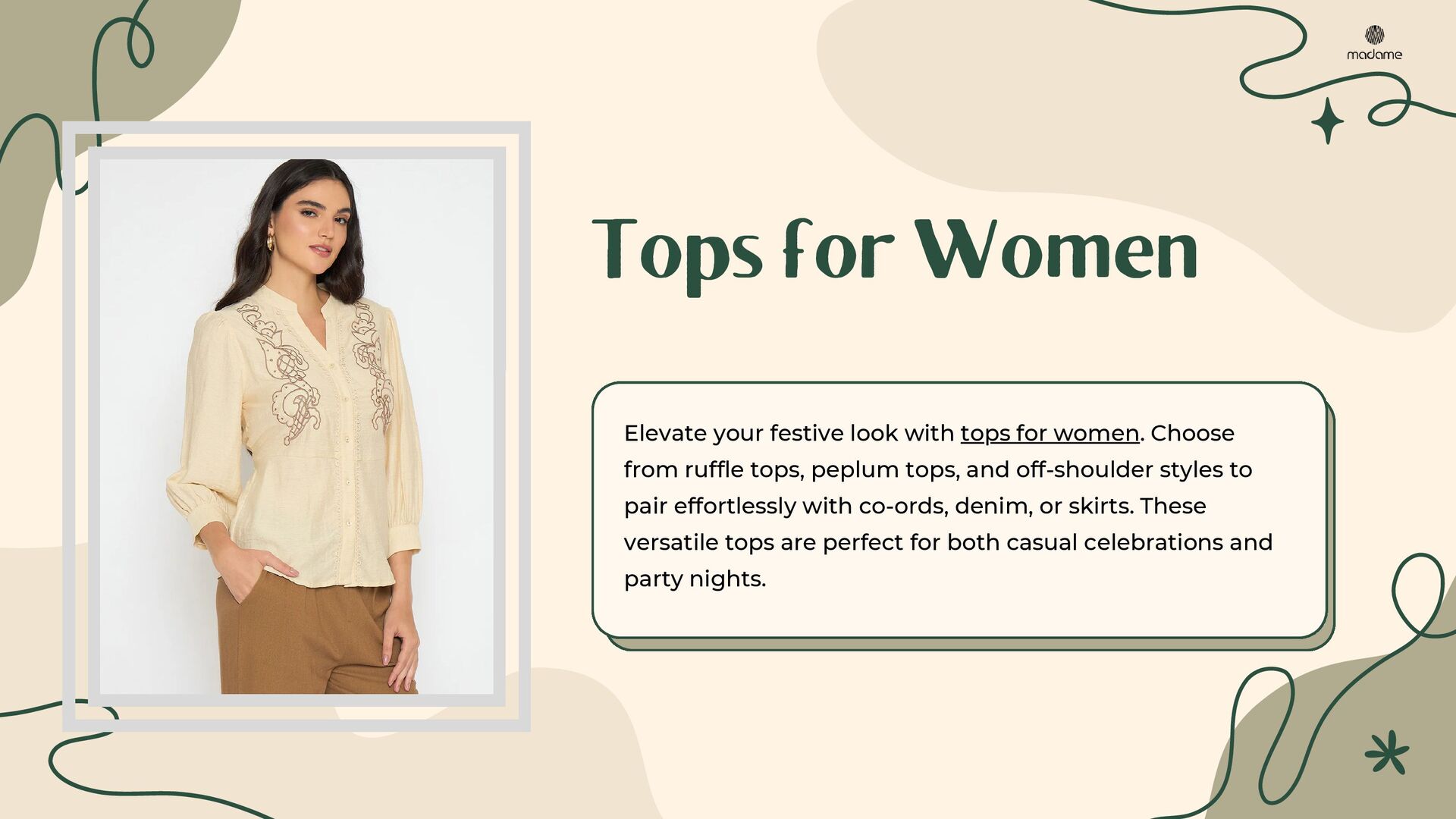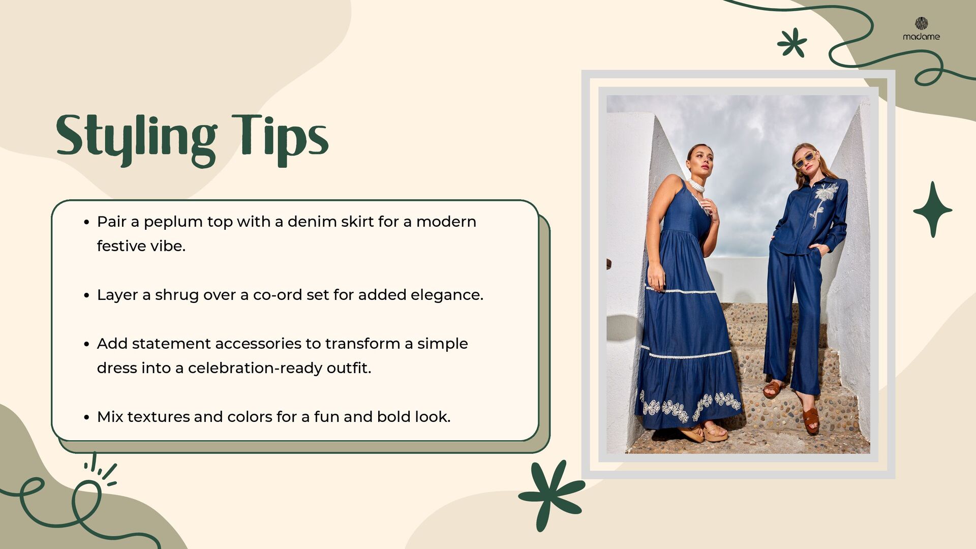 Discover the ultimate guide to festive and party-ready outfits with Madame. This PDF presentation highlights stylish dresses, trendy tops, versatile denim, chic co-ord sets, elegant cardigans & shrugs, and must-have fashion accessories. Perfectly curated for modern women, it offers styling tips to create effortless looks for every occasion. Explore timeless western wear for women and upgrade your wardrobe with Madame’s signature collection.