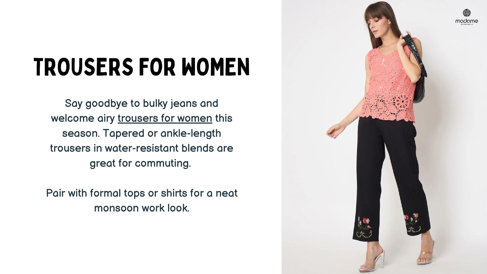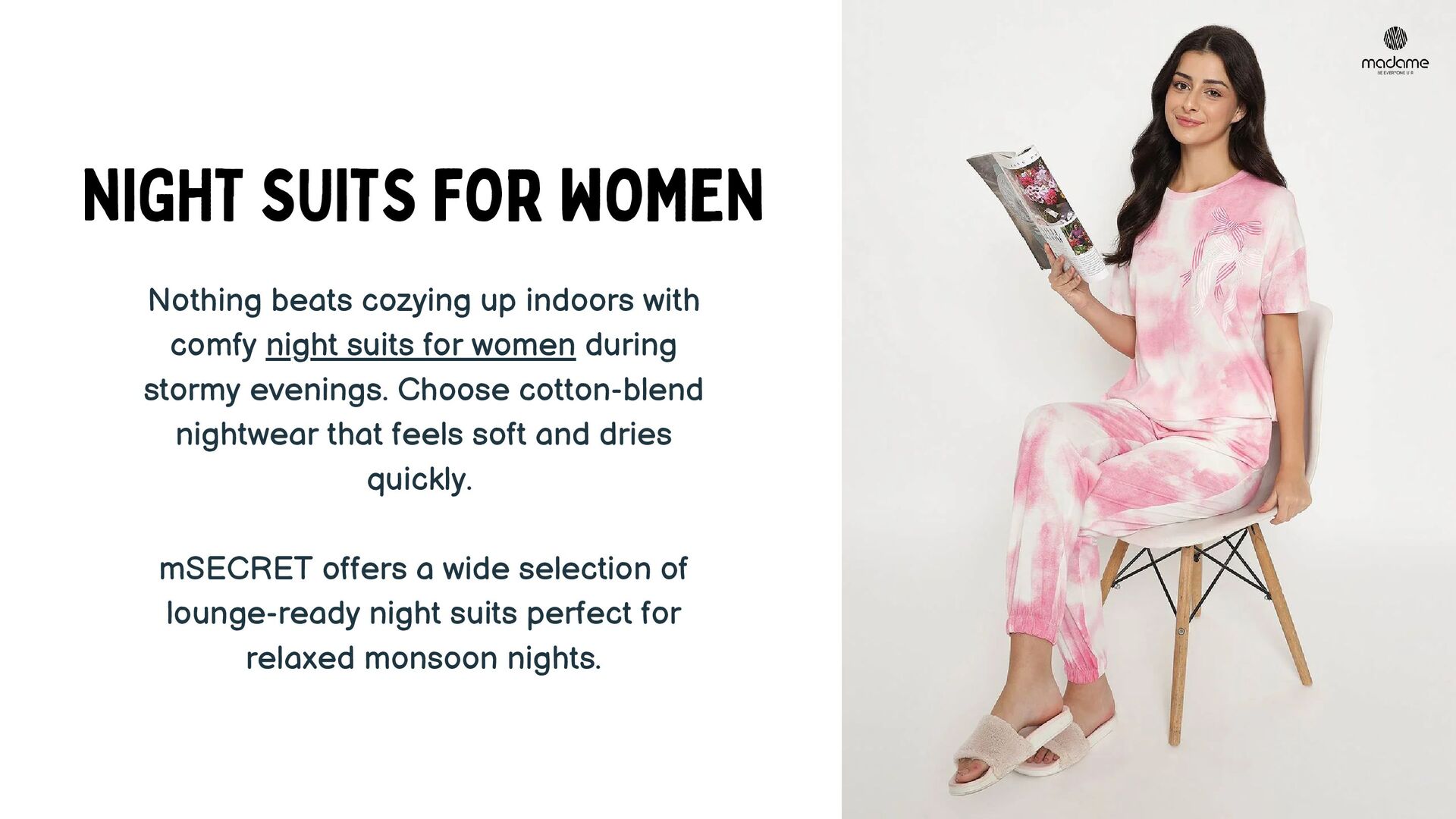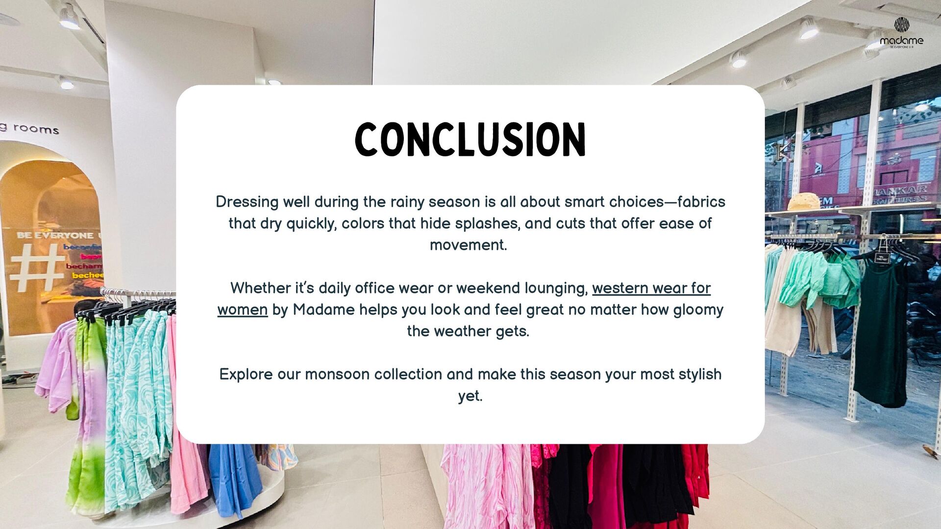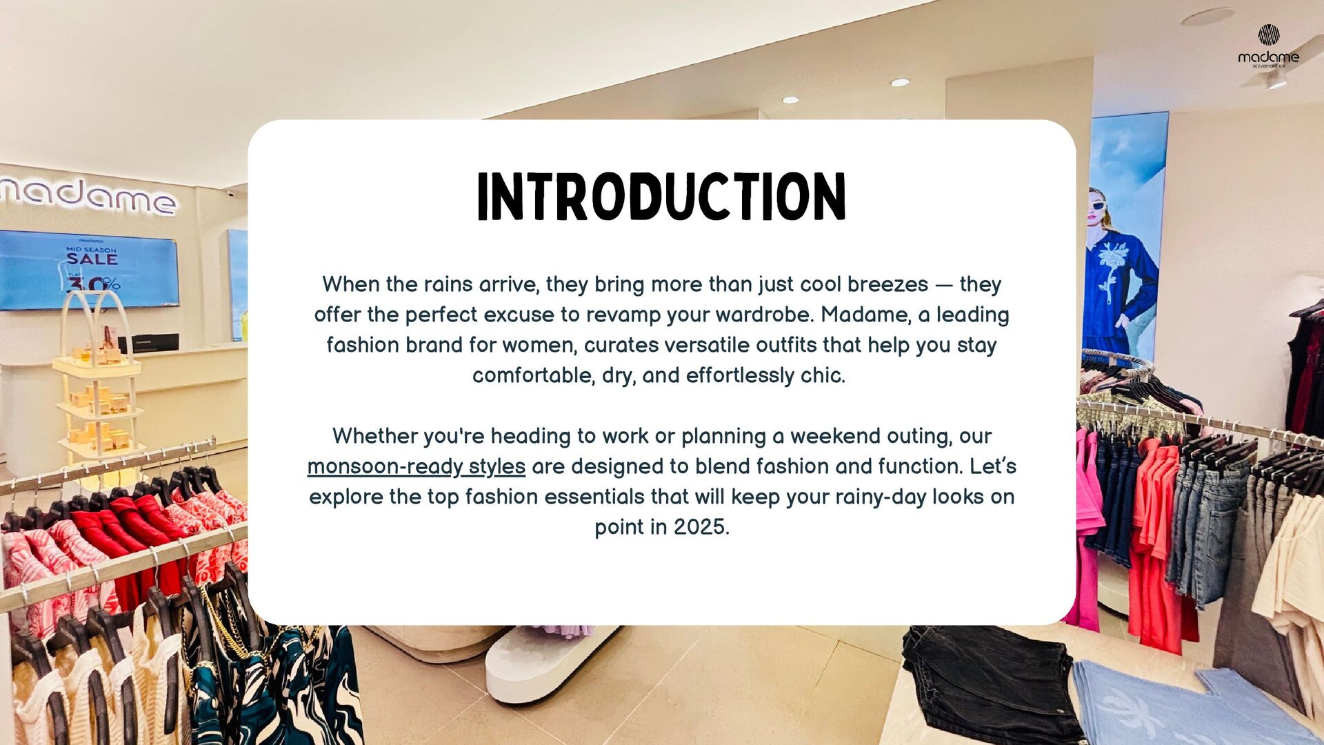 Stay effortlessly chic this rainy season with Madame’s Monsoon Fashion Guide 2025. This PDF highlights must-have western wear for women—from lightweight shirts and airy trousers to lounge-ready night suits. Get practical styling tips and embrace the rain in style with monsoon-friendly fabrics and vibrant silhouettes.