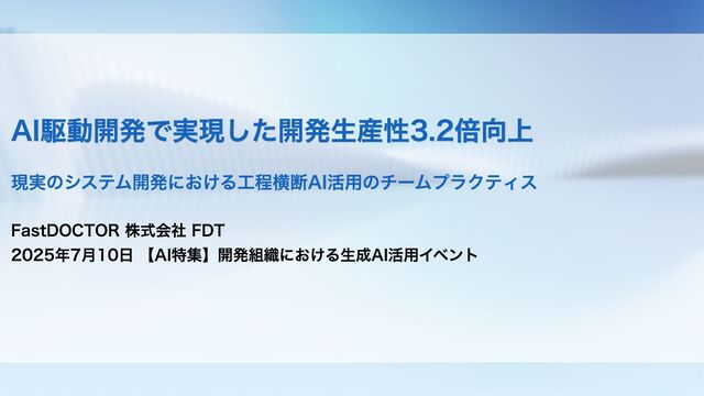 AI駆動開発で実現した開発生産性3.2倍向上 AI駆動開発で実現した開発生産性3.2倍向上 現実のシステム開発における工程横断AI活用のチームプラクティス FastDOCTOR 株式会社 FDT 2025年7月10日 【AI特集】開発組織における生成AI活用イベント