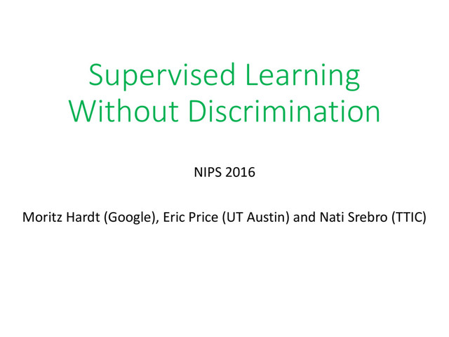 (e.g. credit history, payment history, rent and house purchase history, number of dependents, driving record, employment record, education, etc) • Protected attribute (e.g. race) • Prediction target (e.g. load defaulting, non-appearance, recidivism) • Learn predictor () or (, ) for • Learn based on training set , , =1.. …can mostly assume population distribution (, , ) is known • What does it mean for to be non-discriminatory?