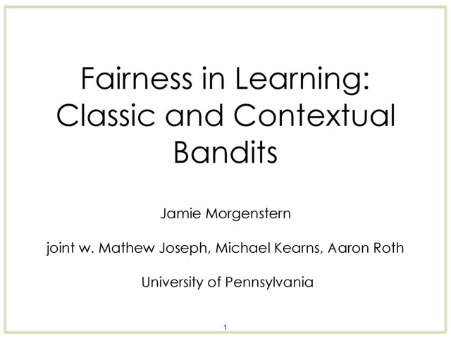 ’13, HDFMB ’11, ZKC ’11, …. “Group” Fairness - CV ’10, FKL ’16, JL’15, KC ’11, KKZ ’12, KAAS ’12… “Individual” Fairness - Dwork et al, 2012 - Johnson, Foster, Stine ’16 - Hardt, Price, Srebro ’16 - Kleinberg, Mullainathan, Raghavan ’16 11 Related Work Our work focuses on fair learning rather than finding a fair model