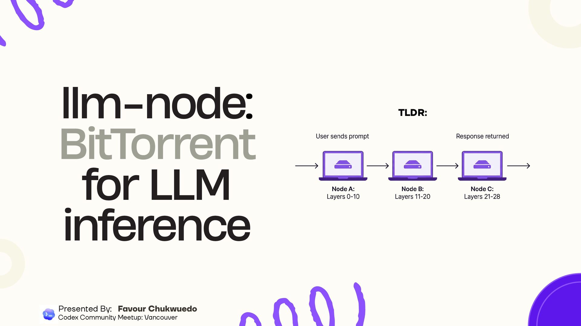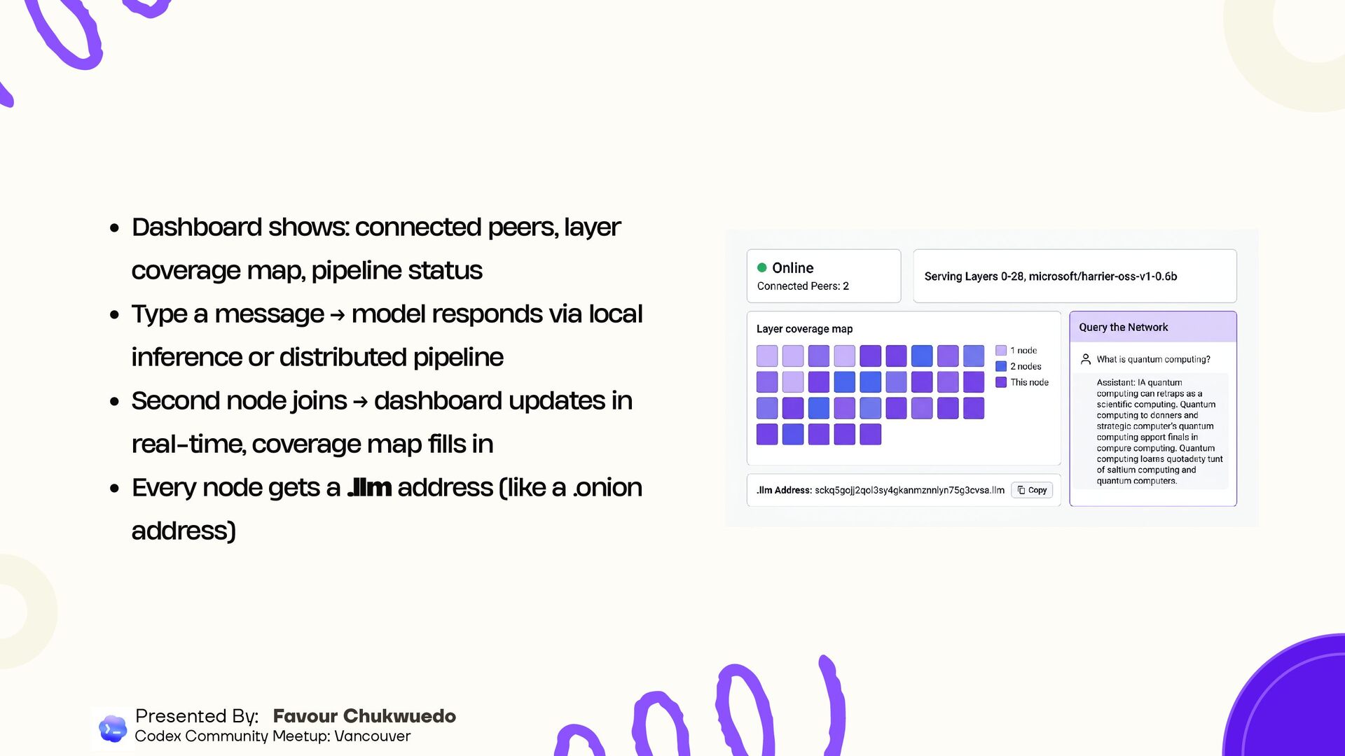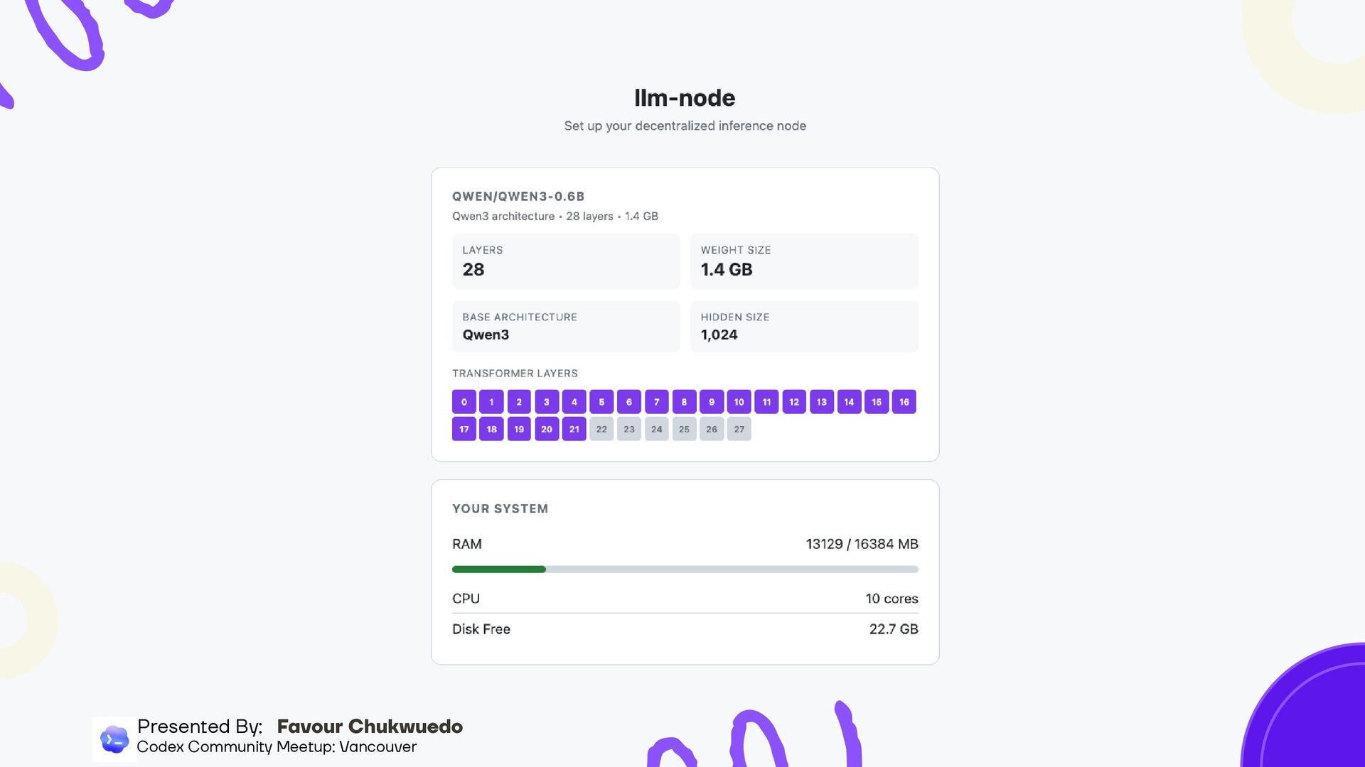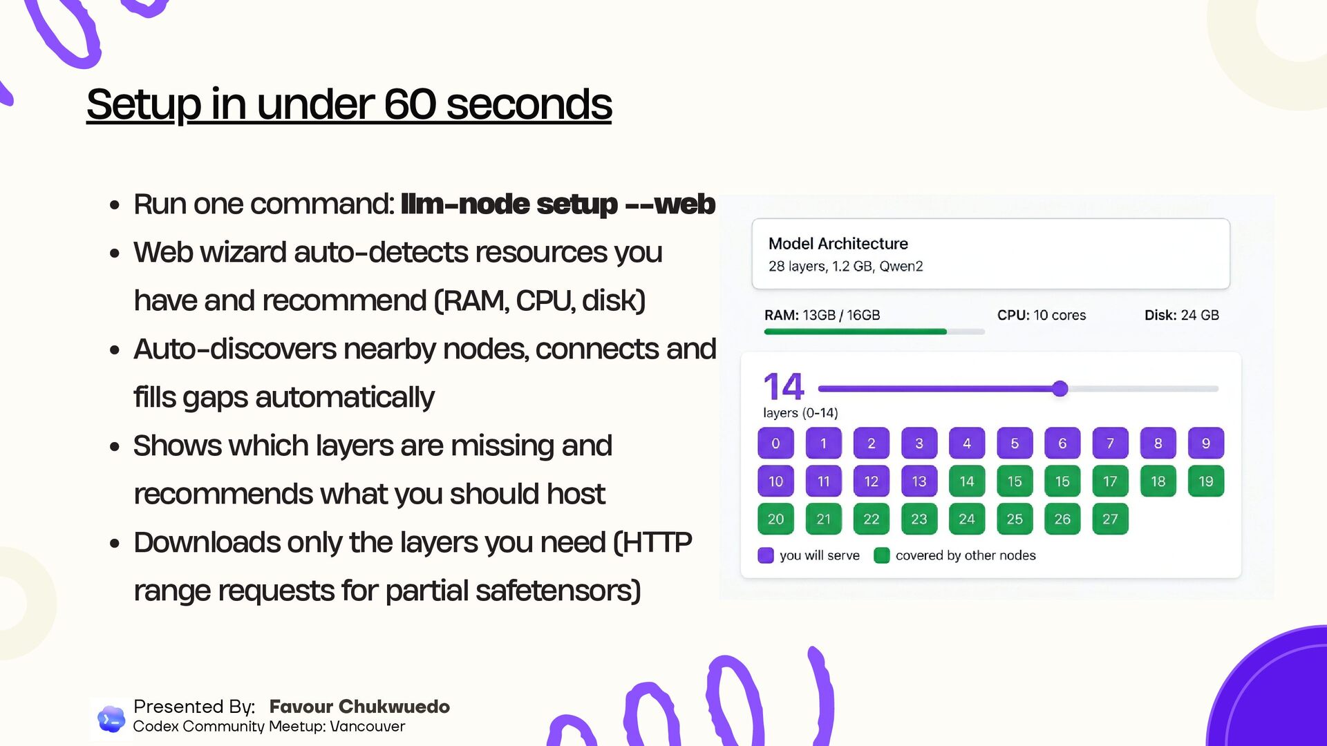 you have and recommend (RAM, CPU, disk) Auto-discovers nearby nodes, connects and fills gaps automatically Shows which layers are missing and recommends what you should host Downloads only the layers you need (HTTP range requests for partial safetensors) Setup in under 60 seconds Presented By: Favour Chukwuedo Codex Community Meetup: Vancouver