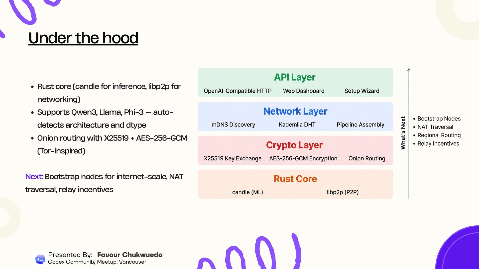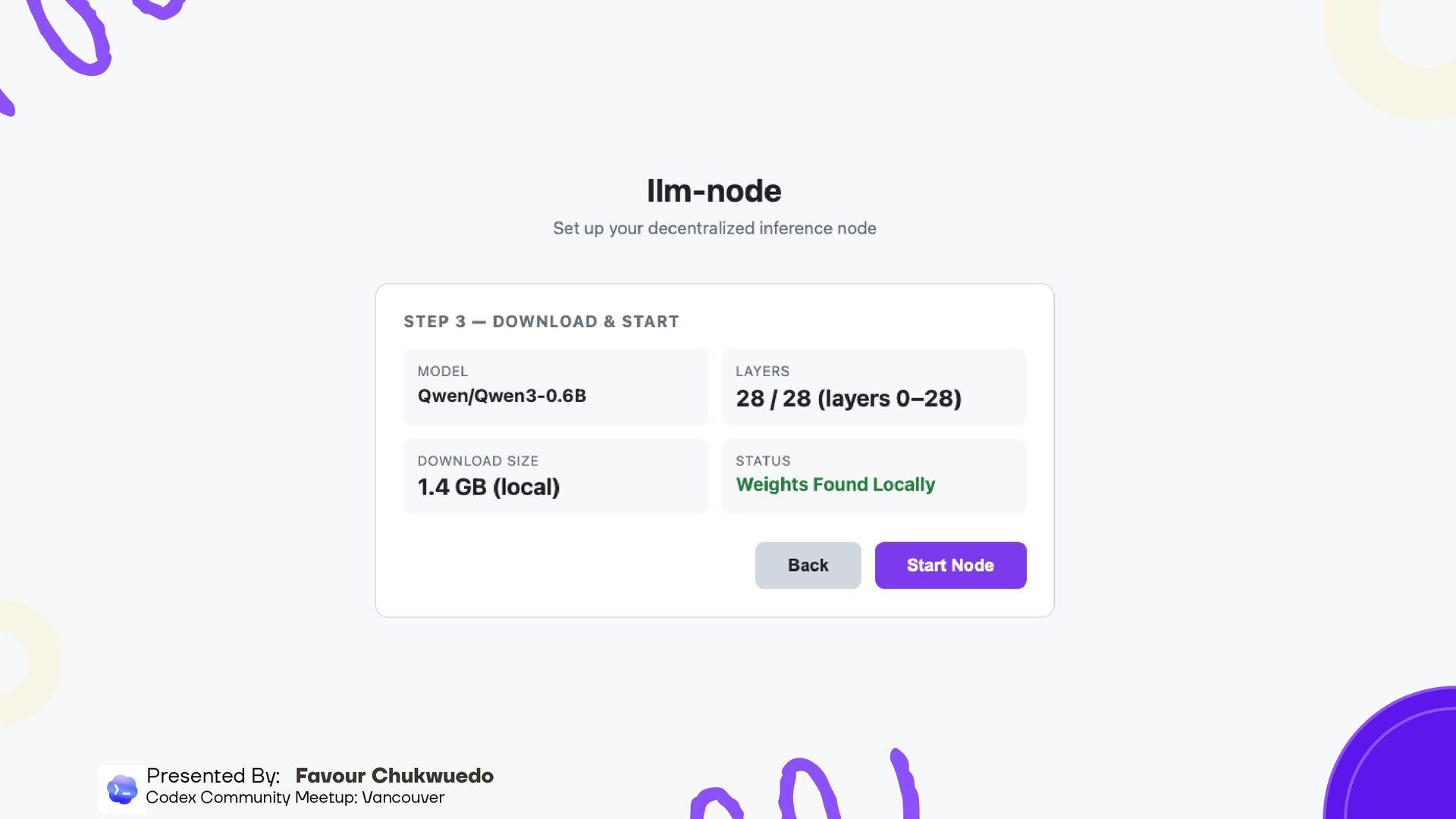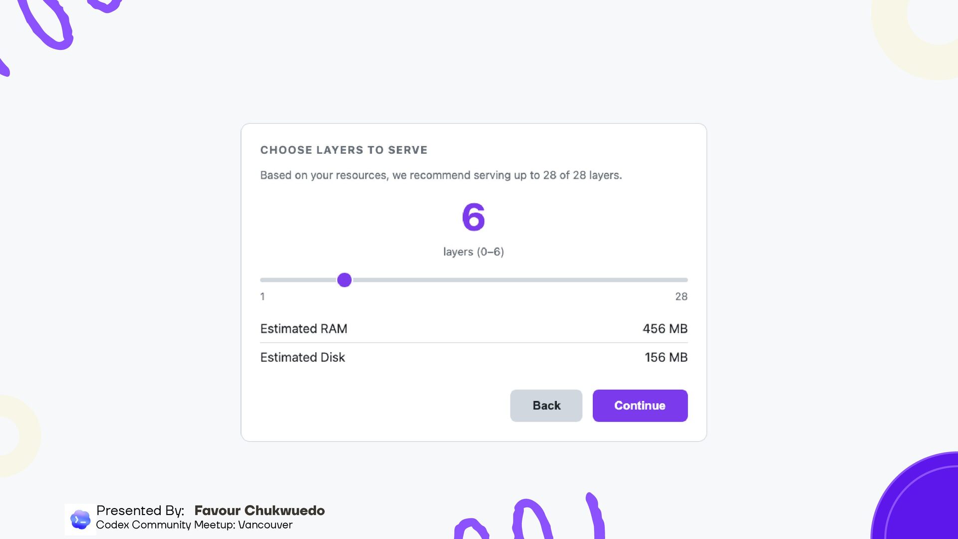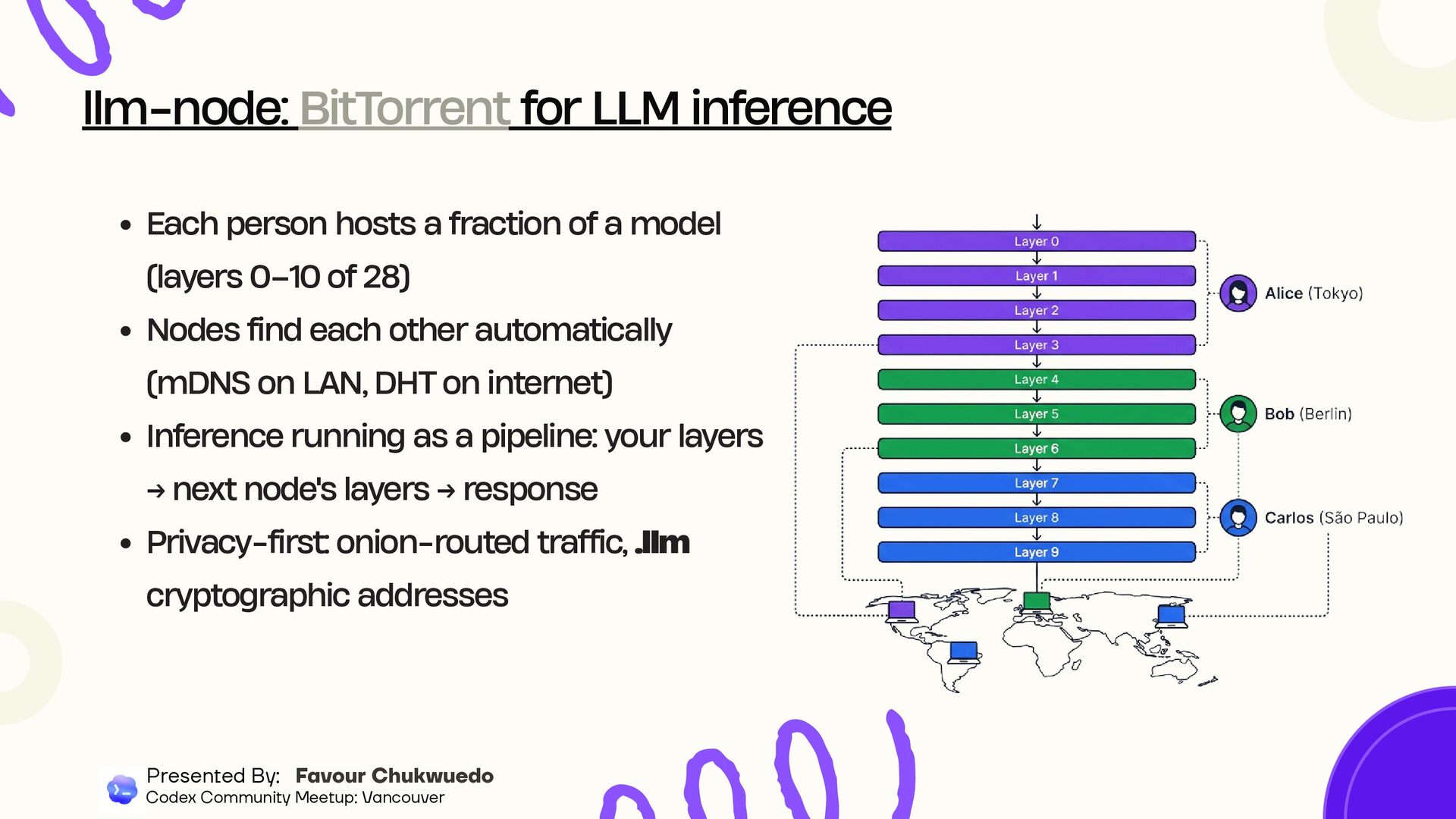 you have and recommend (RAM, CPU, disk) Auto-discovers nearby nodes, connects and fills gaps automatically Shows which layers are missing and recommends what you should host Downloads only the layers you need (HTTP range requests for partial safetensors) Setup in under 60 seconds Presented By: Favour Chukwuedo Codex Community Meetup: Vancouver