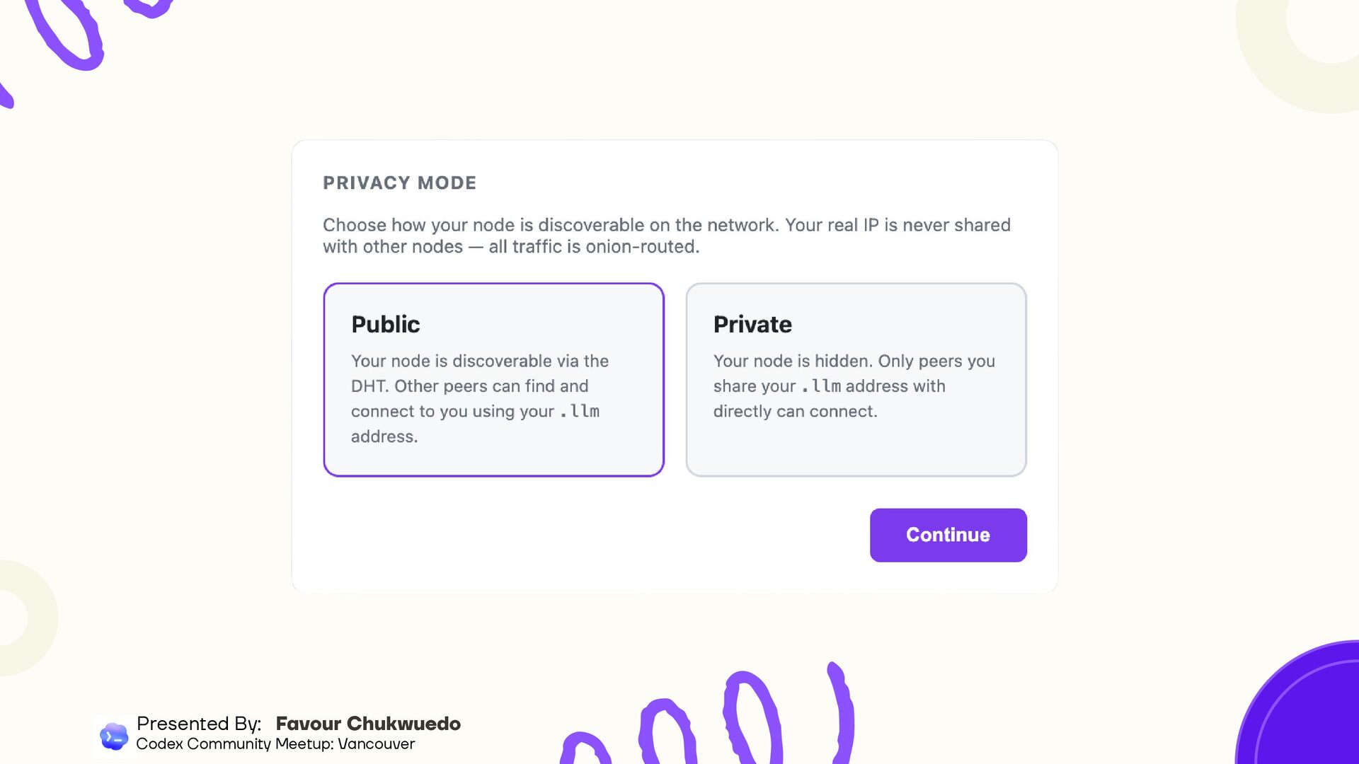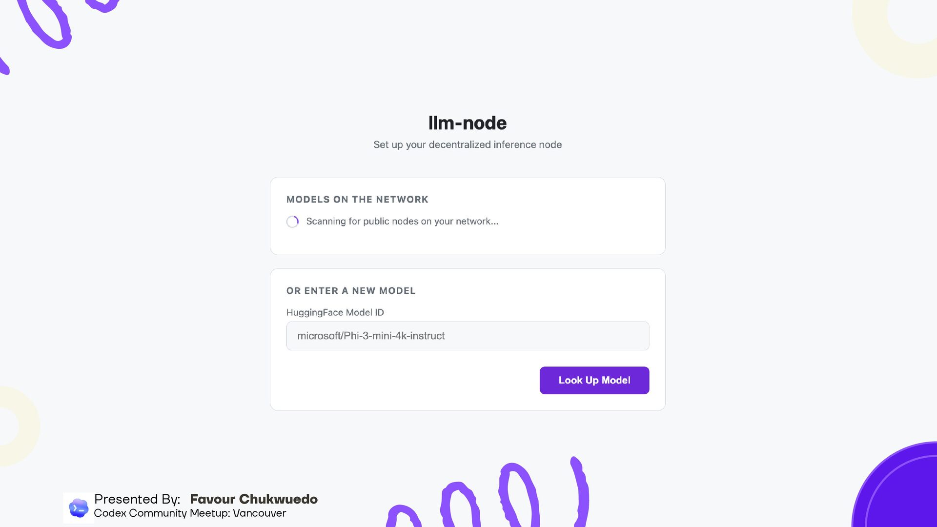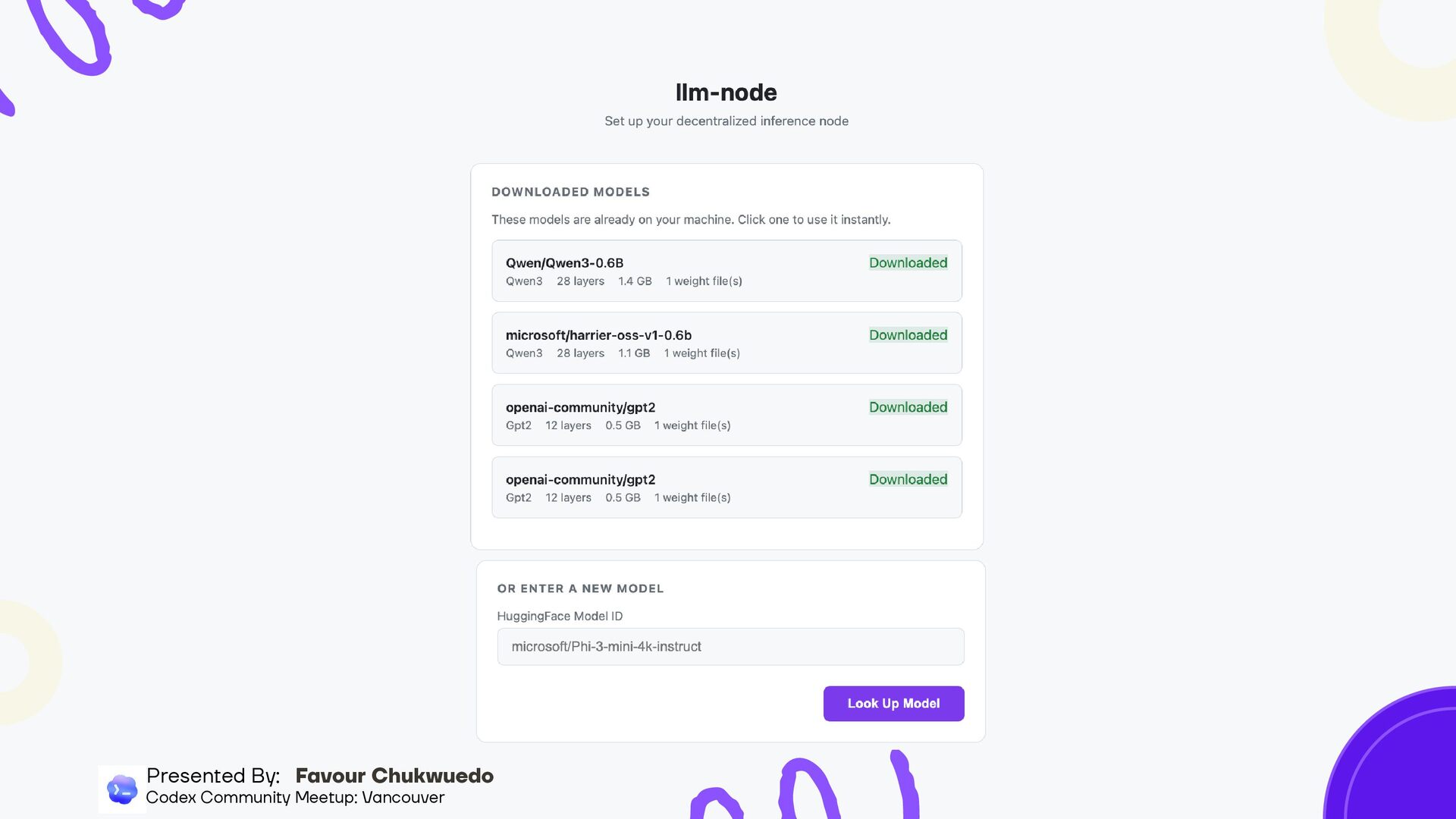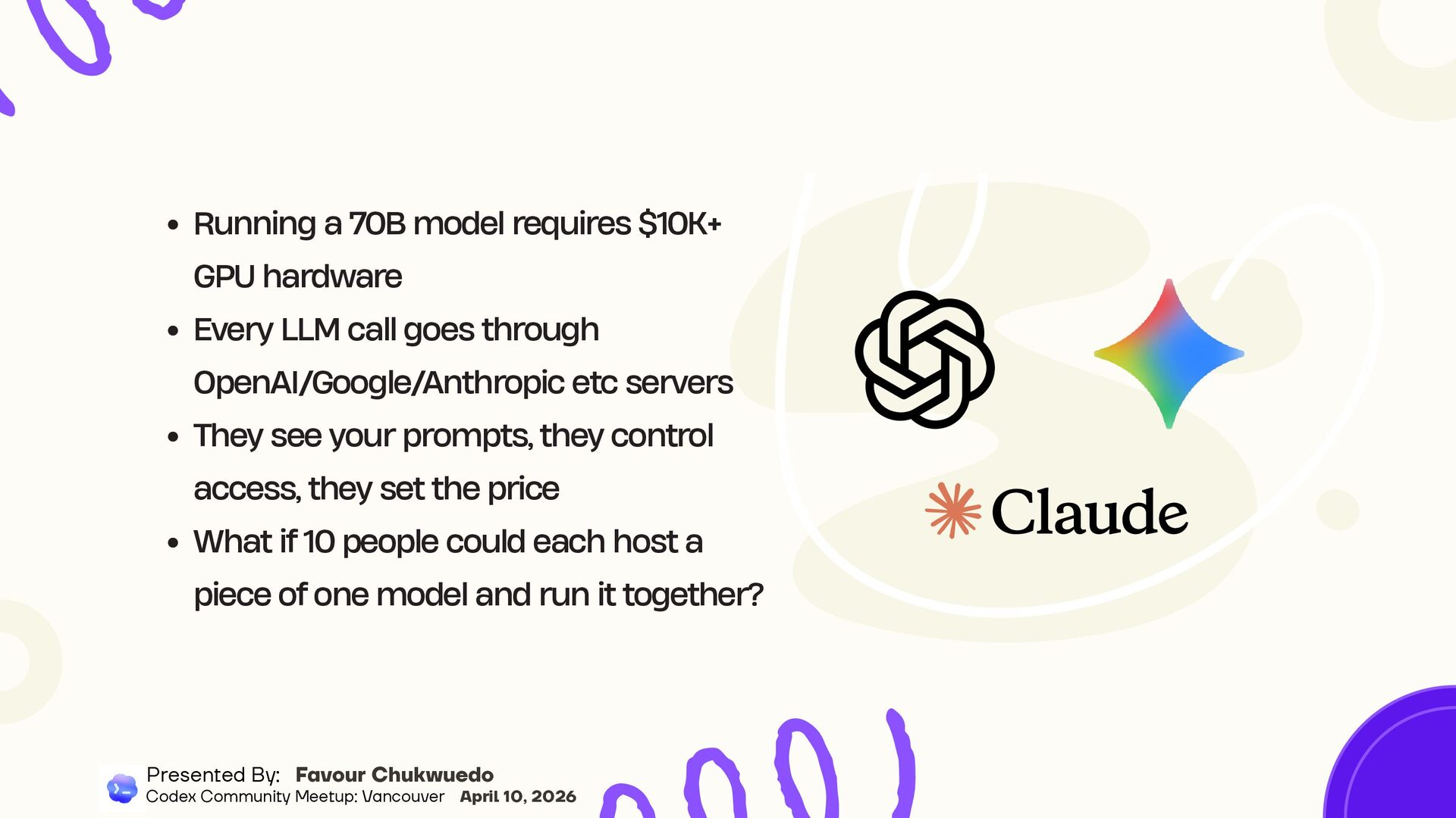 you have and recommend (RAM, CPU, disk) Auto-discovers nearby nodes, connects and fills gaps automatically Shows which layers are missing and recommends what you should host Downloads only the layers you need (HTTP range requests for partial safetensors) Setup in under 60 seconds Presented By: Favour Chukwuedo Codex Community Meetup: Vancouver
