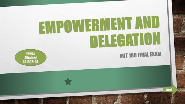 interchangeably, there are several areas of difference between them. Delegation is a straightforward means of assigning tasks to your employees. Empowerment seeks to give an employee more authority with the aim of developing employee commitment, enthusiasm and expertise, while encouraging innovation that will benefit the organization over time. Empowerment necessarily requires some level of delegation, but not all instances of delegation will produce an empowered employee. Delegation Empowerment Normally refers to the assignment of a task. It is work-focused May involve non-work activities, emotions, and relationships. It involves the way people think about themselves next HOME BACK 18/05/2022 FAWAZ ALBALAWI 421902108 5