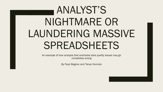 start with an example of an analysis performed in an Excel spreadsheet and will perform step by step invalidation of its conclusions. For this talk we will use a synthetic dataset
