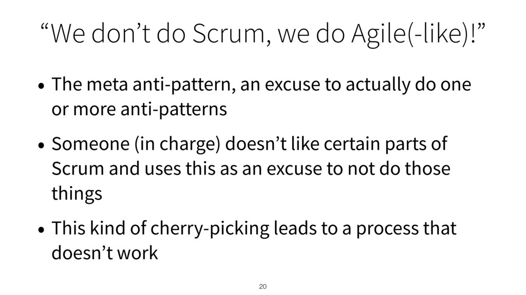 In order to enjoy the benefits of Scrum you must, at least, get the basics right. This presentation lists some of the pitfalls that many projects walk into. After this presentation you will be better equipped to spot anti-patterns in your projects and be able to fix the architecture of your Scrum project.