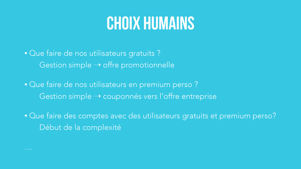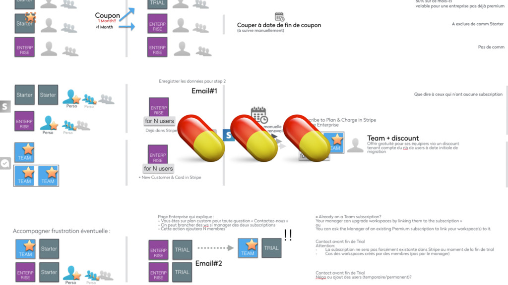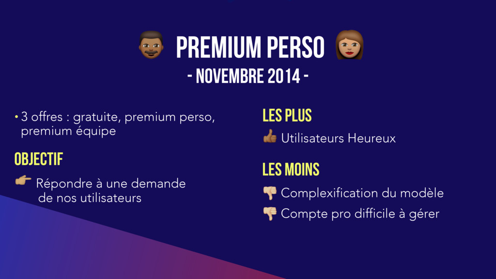 Gestion simple ➝ offre promotionnelle • Que faire de nos utilisateurs en premium perso ? Gestion simple ➝ couponnés vers l’offre entreprise • Que faire des comptes avec des utilisateurs gratuits et premium perso? Début de la complexité …
