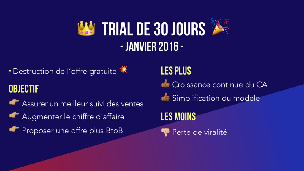 $ Perte de viralité OBJECTIF " Assurer un meilleur suivi des ventes LES PLUS LES Moins Trial DE 30 JOURS - JANVIER 2016 - " Augmenter le chiffre d’affaire " Proposer une offre plus BtoB # Simplification du modèle