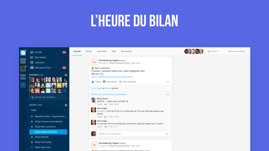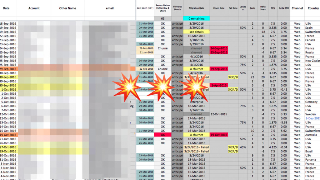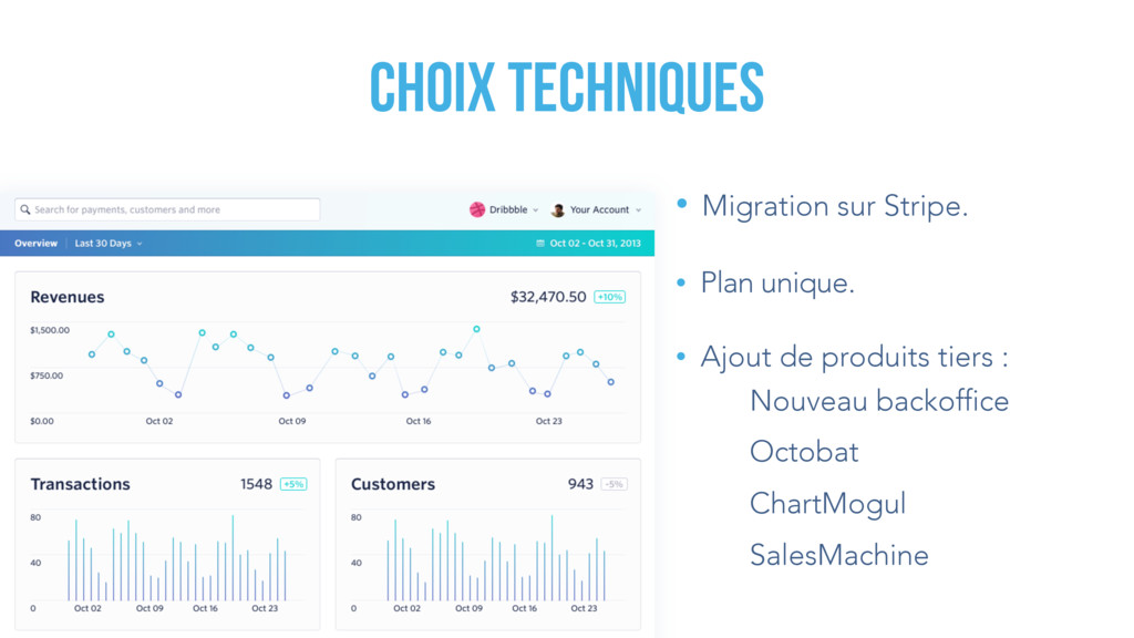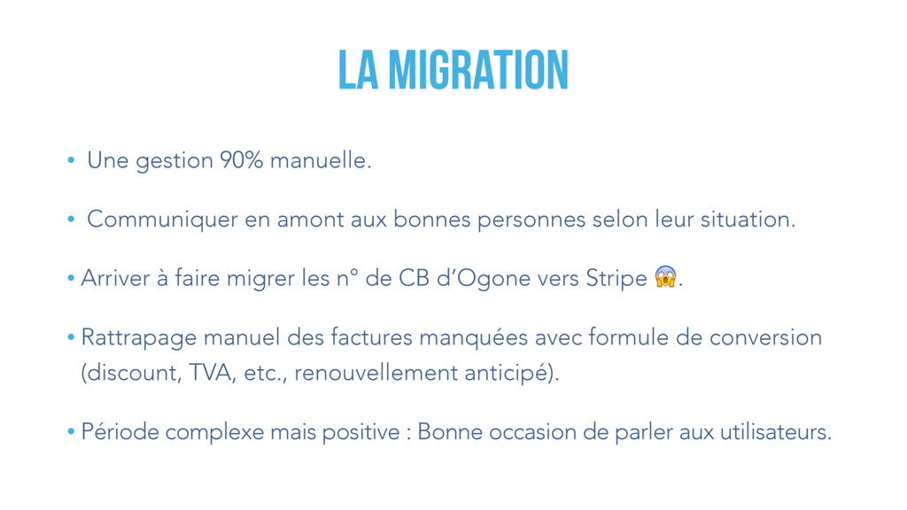 amont aux bonnes personnes selon leur situation. • Arriver à faire migrer les n° de CB d’Ogone vers Stripe . • Rattrapage manuel des factures manquées avec formule de conversion (discount, TVA, etc., renouvellement anticipé). • Période complexe mais positive : Bonne occasion de parler aux utilisateurs.