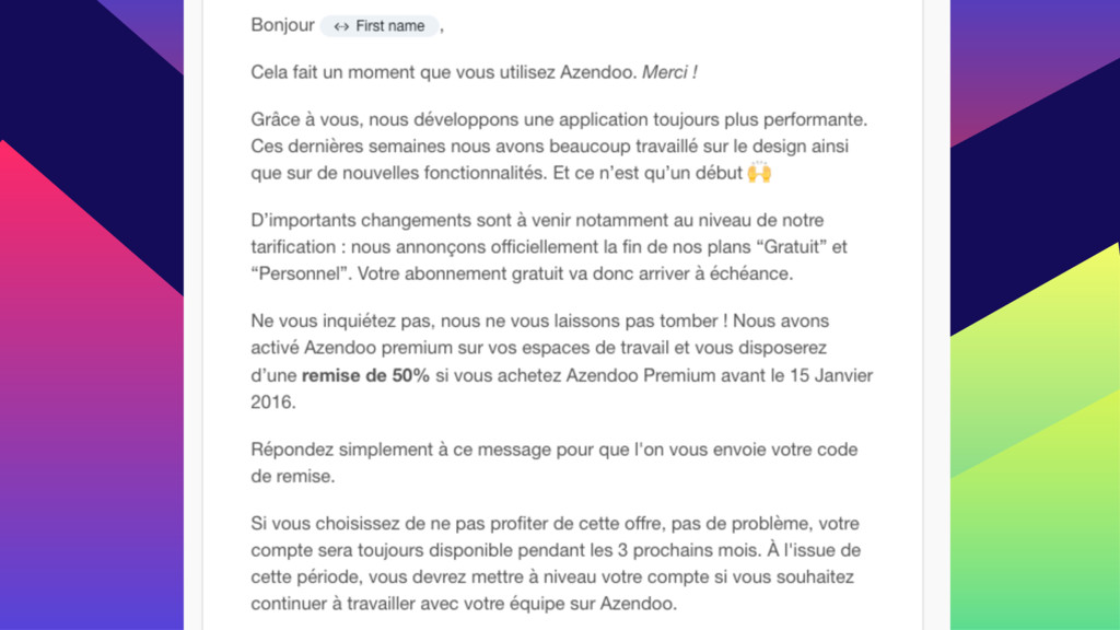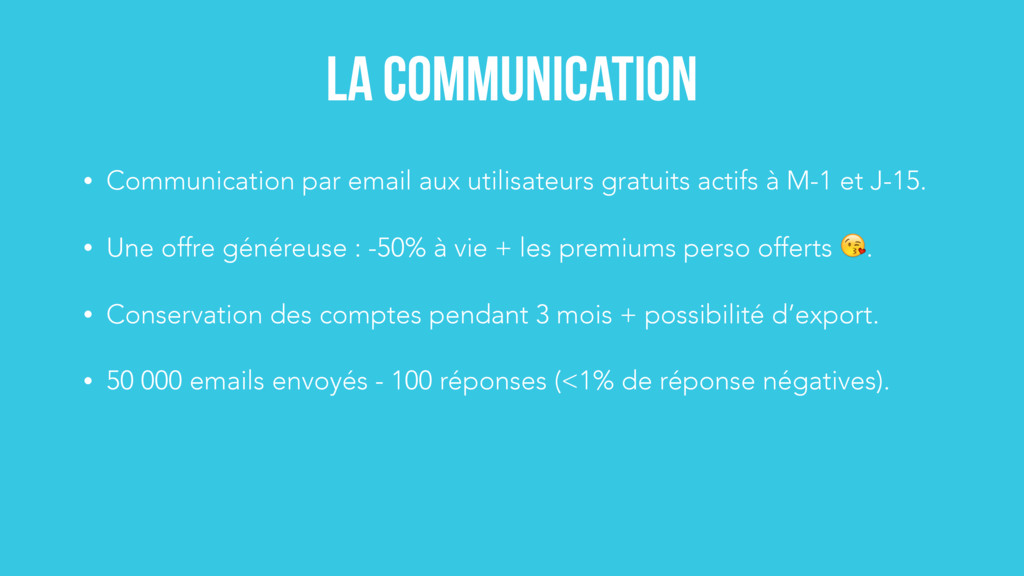 à M-1 et J-15. • Une offre généreuse : -50% à vie + les premiums perso offerts . • Conservation des comptes pendant 3 mois + possibilité d’export. • 50 000 emails envoyés - 100 réponses (<1% de réponse négatives).