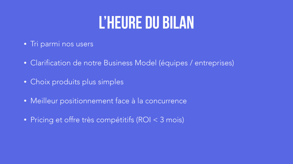 Model (équipes / entreprises) • Choix produits plus simples • Meilleur positionnement face à la concurrence • Pricing et offre très compétitifs (ROI < 3 mois) L’heure du bilan