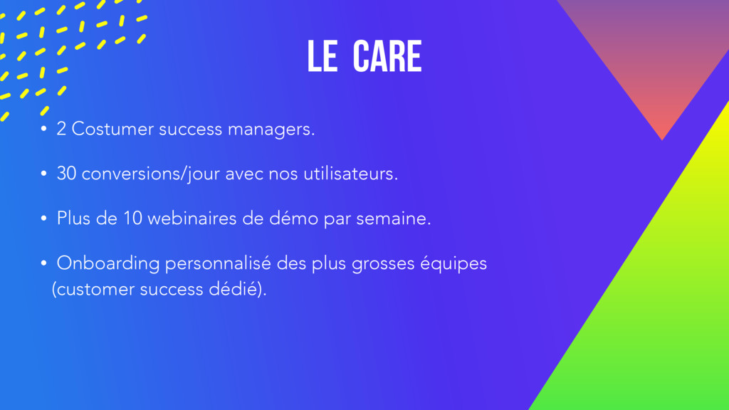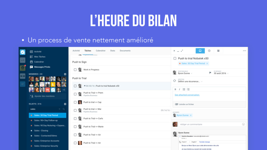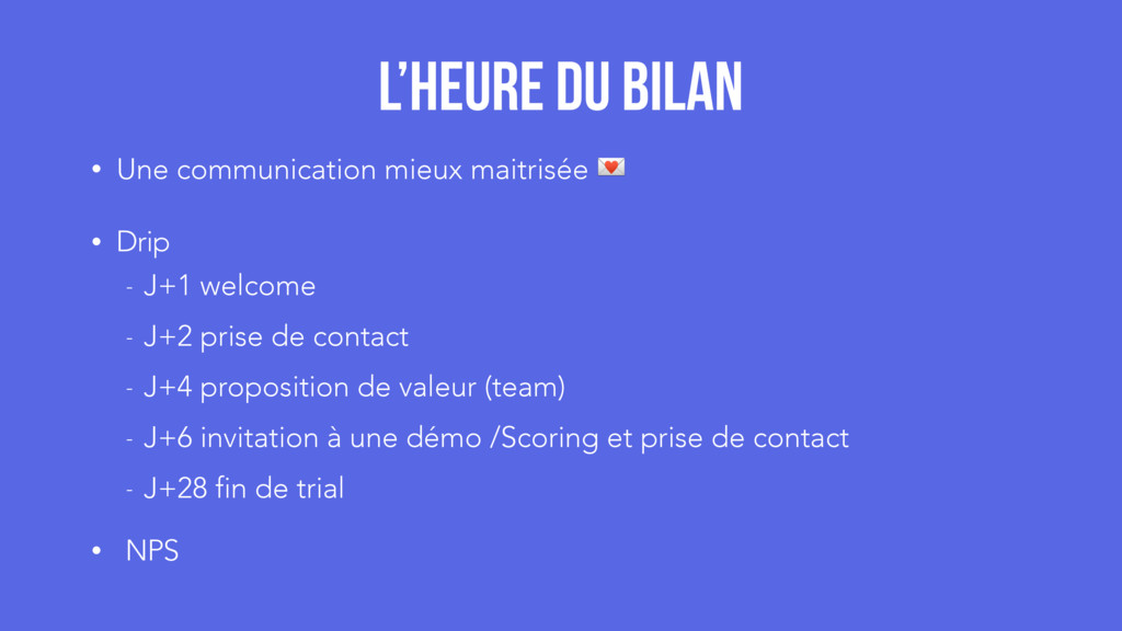 - J+2 prise de contact - J+4 proposition de valeur (team) - J+6 invitation à une démo /Scoring et prise de contact - J+28 fin de trial • NPS L’heure du bilan