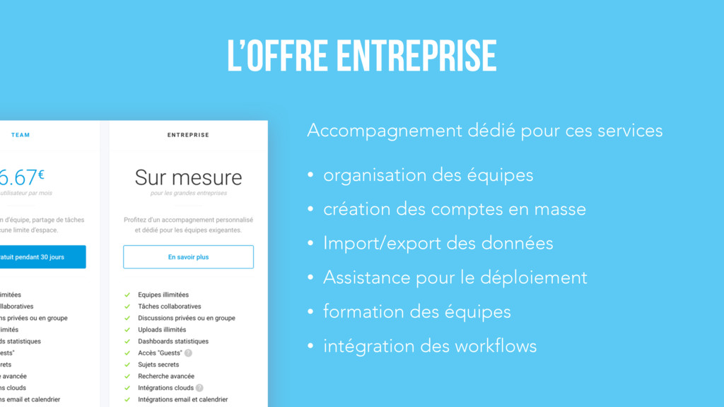 création des comptes en masse • Import/export des données • Assistance pour le déploiement • formation des équipes • intégration des workflows L’offre entreprise