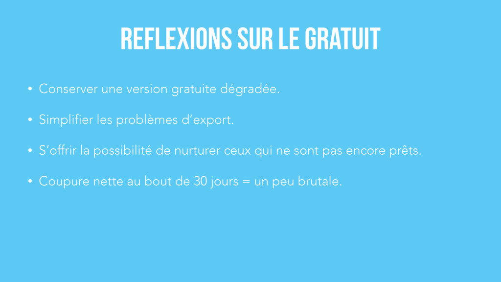 d’export. • S’offrir la possibilité de nurturer ceux qui ne sont pas encore prêts. • Coupure nette au bout de 30 jours = un peu brutale. Reflexions sur le gratuit