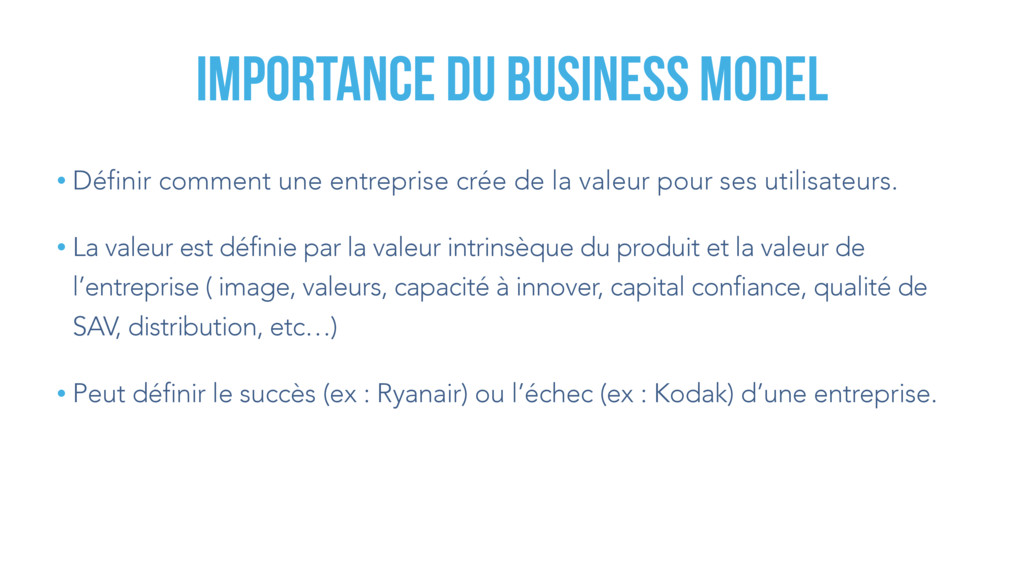 ses utilisateurs. • La valeur est définie par la valeur intrinsèque du produit et la valeur de l’entreprise ( image, valeurs, capacité à innover, capital confiance, qualité de SAV, distribution, etc…) • Peut définir le succès (ex : Ryanair) ou l’échec (ex : Kodak) d’une entreprise. importance du business model