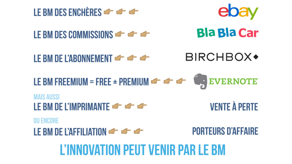 COMMISSIONS " " " LE BM DE L’ABONNEMENT " " " Le BM freemium = free + premium " " " Le BM de l’affiliation " " " Le BM de l’imprimante " " " MAIS AUSSI Ou encore vente à perte porteurs d’affaire L’innovation peut venir par le BM