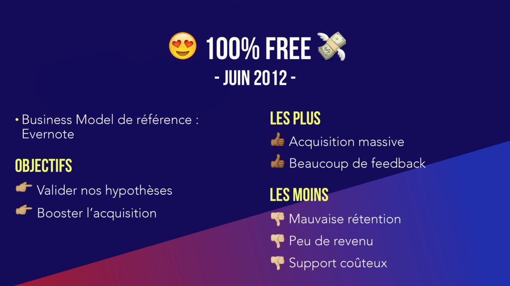 feedback $ Mauvaise rétention $ Peu de revenu $ Support coûteux 100% Free OBJECTIFS " Valider nos hypothèses " Booster l’acquisition LES PLUS LES Moins • Business Model de référence : Evernote