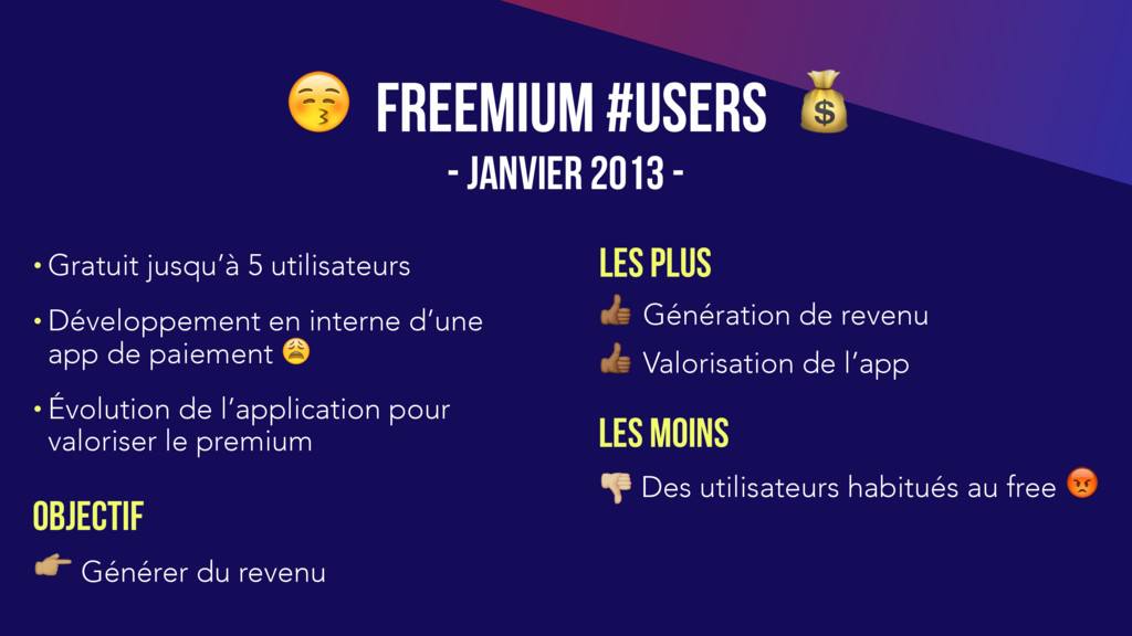 Des utilisateurs habitués au free • Gratuit jusqu’à 5 utilisateurs • Développement en interne d’une app de paiement • Évolution de l’application pour valoriser le premium OBJECTIF " Générer du revenu LES PLUS LES Moins FREeMIUM #USERS - JANVIER 2013 -
