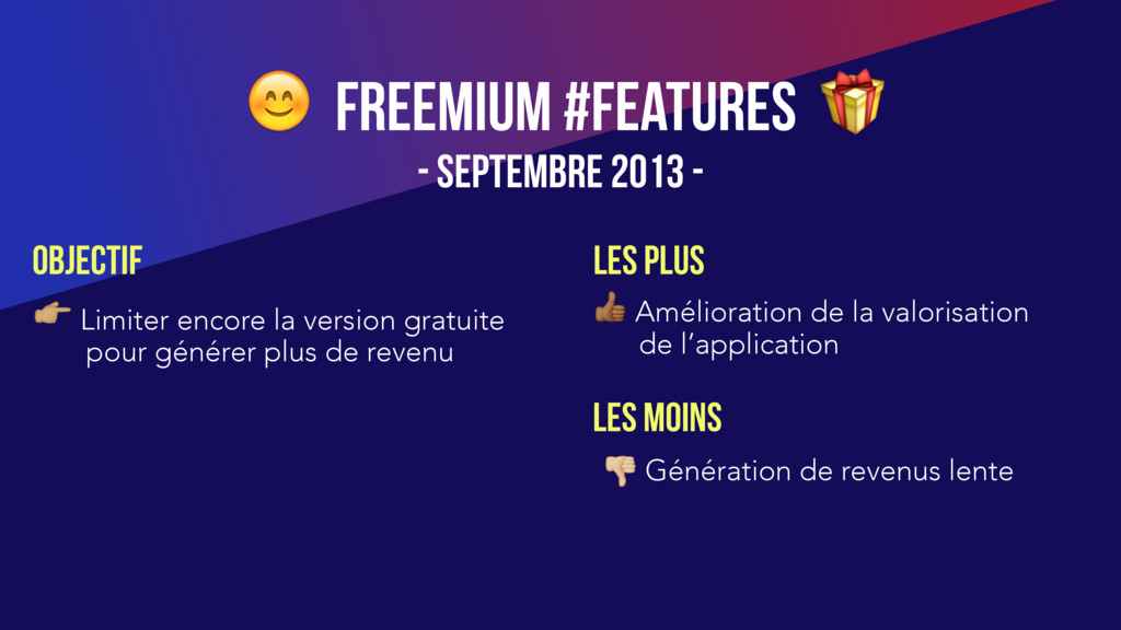 plus de revenu FREEMIUM #features - Septembre 2013 - # Amélioration de la valorisation de l’application $ Génération de revenus lente LES PLUS LES Moins