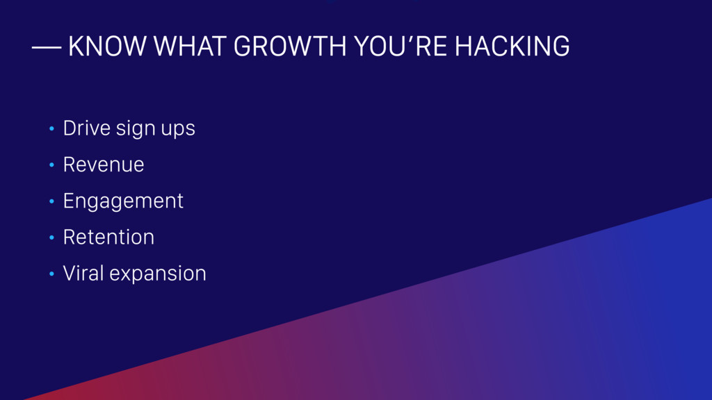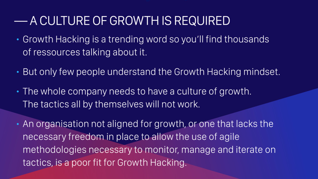 thousands of ressources talking about it. • But only few people understand the Growth Hacking mindset. • The whole company needs to have a culture of growth. The tactics all by themselves will not work. • An organisation not aligned for growth, or one that lacks the necessary freedom in place to allow the use of agile methodologies necessary to monitor, manage and iterate on tactics, is a poor fit for Growth Hacking. — A CULTURE OF GROWTH IS REQUIRED