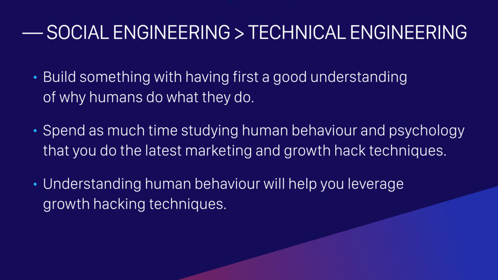 of why humans do what they do. • Spend as much time studying human behaviour and psychology that you do the latest marketing and growth hack techniques. • Understanding human behaviour will help you leverage growth hacking techniques. — SOCIAL ENGINEERING > TECHNICAL ENGINEERING