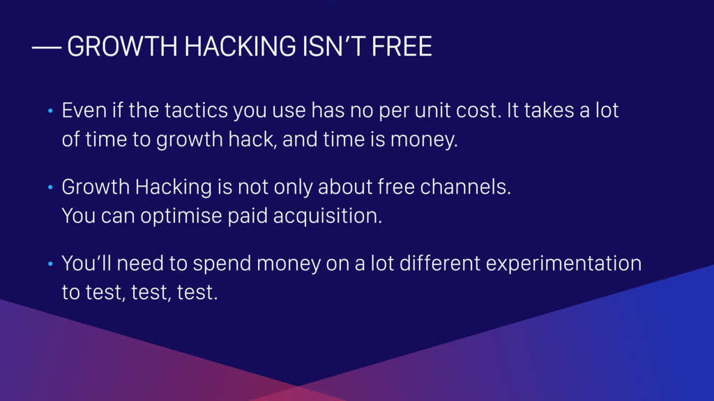 unit cost. It takes a lot of time to growth hack, and time is money. • Growth Hacking is not only about free channels. You can optimise paid acquisition. • You’ll need to spend money on a lot different experimentation to test, test, test. — GROWTH HACKING ISN’T FREE