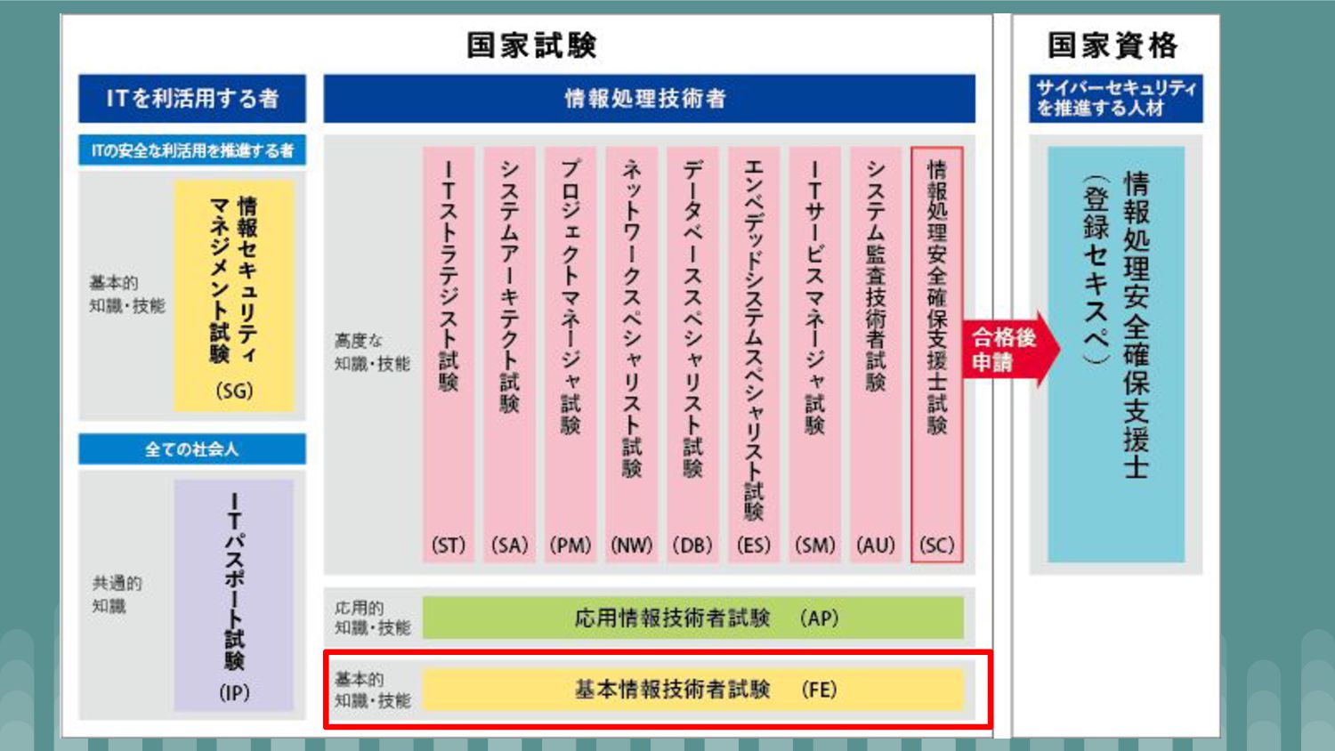 情報処理技術者試験とは 情報処理技術者試験は、「情報処理の促進に関する法律」に基づき経済産業省 が、情報処理技術者としての「知識・技能」が一定以上の水準であることを認定 している国家試験です。 情報システムを構築・運用する「技術者」から情報システムを利用する「エンド ユーザ(利用者)」まで、ITに関係するすべての人に活用いただける試験として実 施しています。特定の製品やソフトウェアに関する試験ではなく、情報技術の背 景として知るべき原理や基礎となる知識・技能について、幅広く総合的に評価し ています。 ※引用:https://www.jitec.ipa.go.jp/1_08gaiyou/_index_gaiyou.html