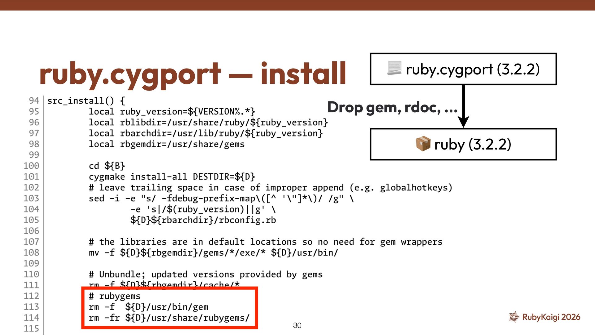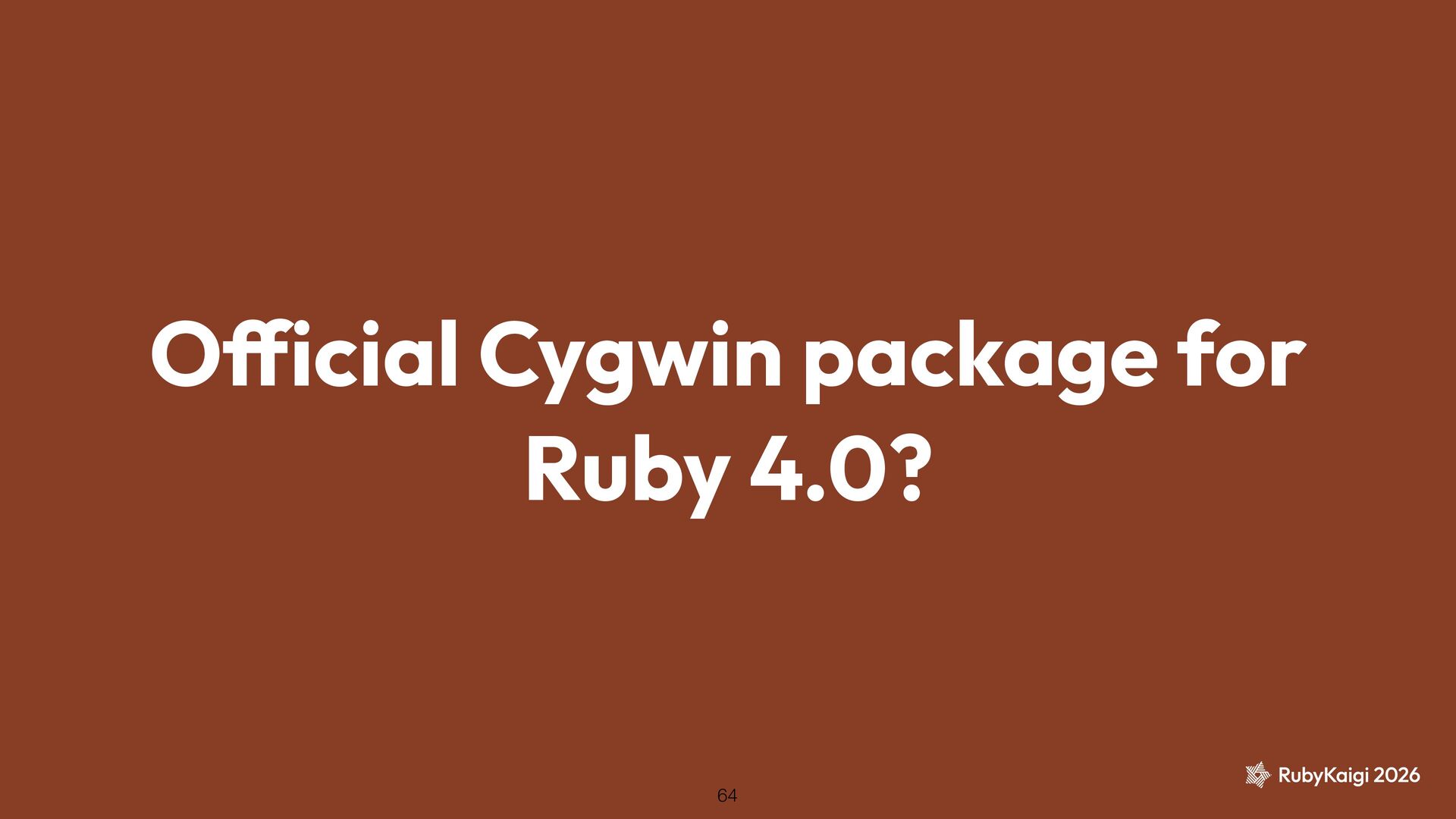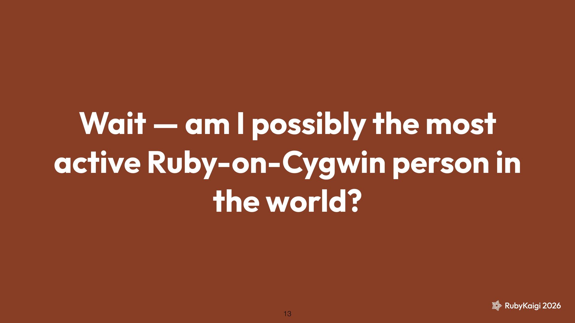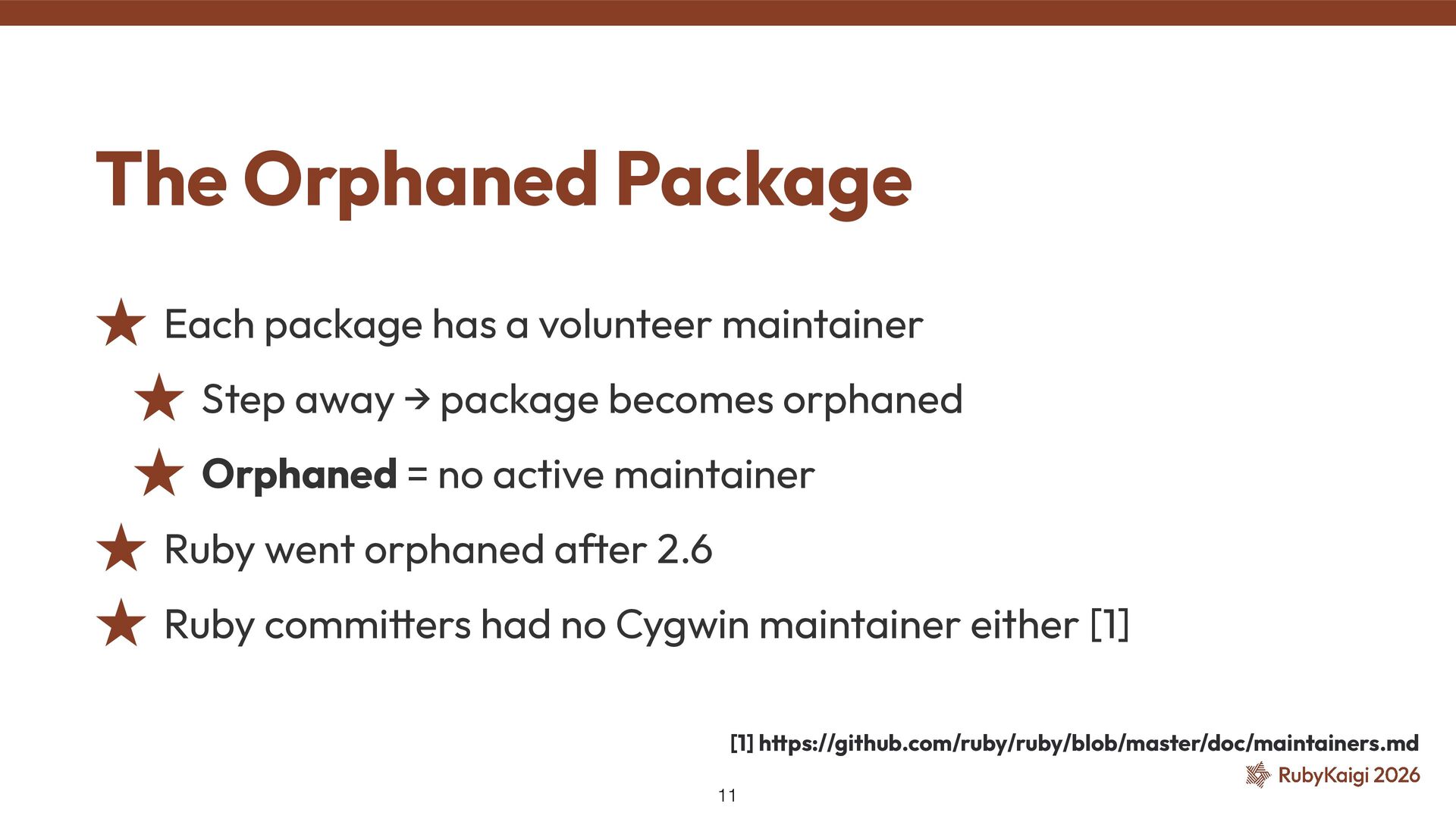 → package becomes orphaned ˒ Orphaned = no active maintainer ˒ Ruby went orphaned after 2.6 ˒ Ruby commi tt ers had no Cygwin maintainer either [1] The Orphaned Package 11 [1] h tt ps://github.com/ruby/ruby/blob/master/doc/maintainers.md