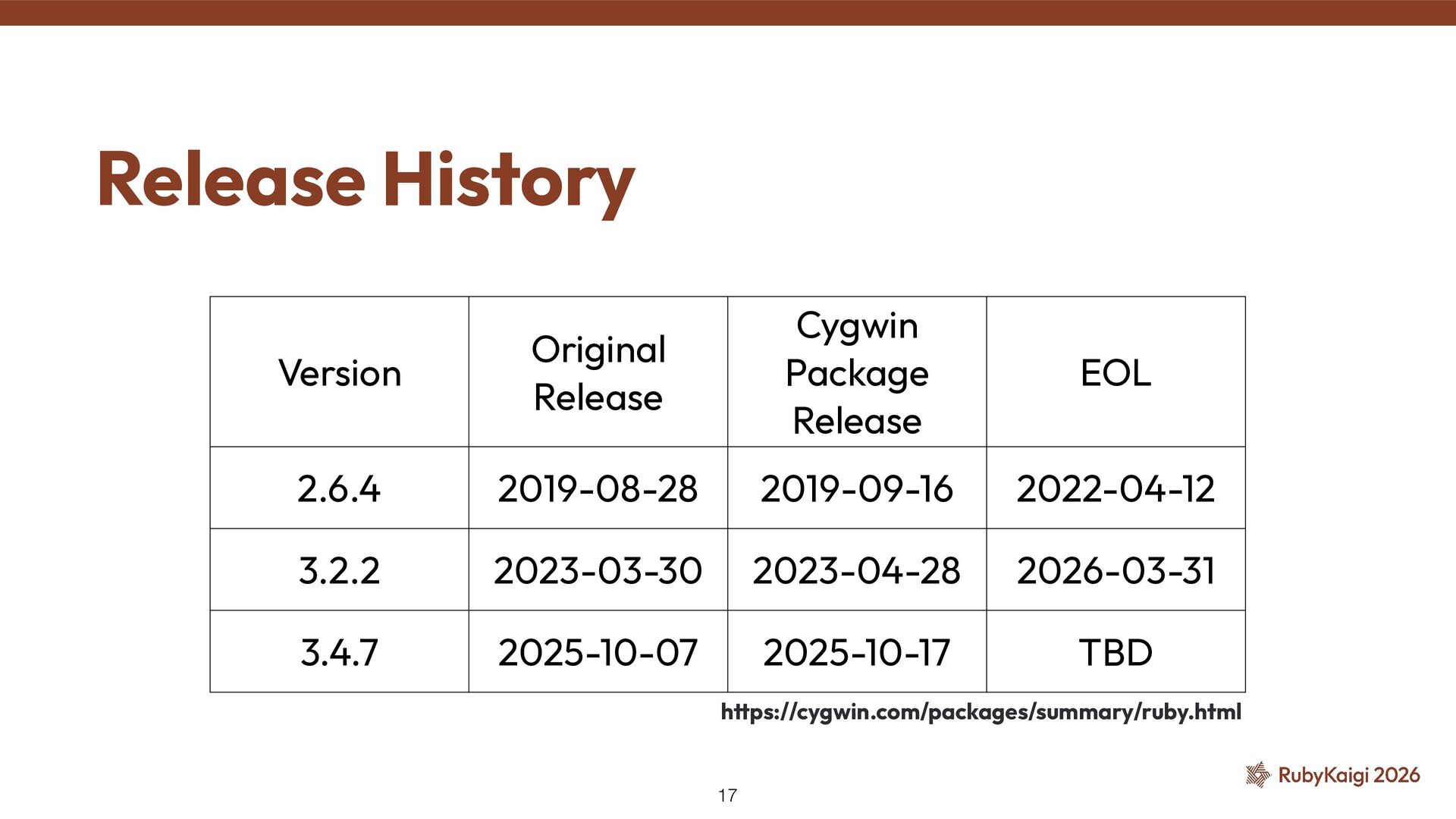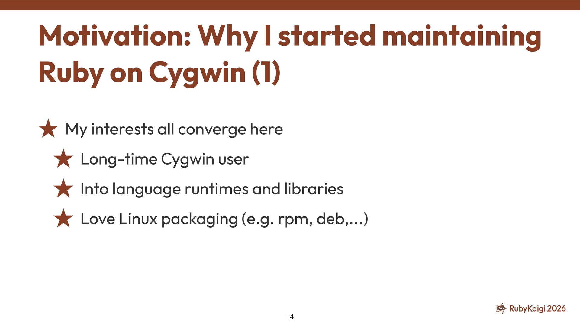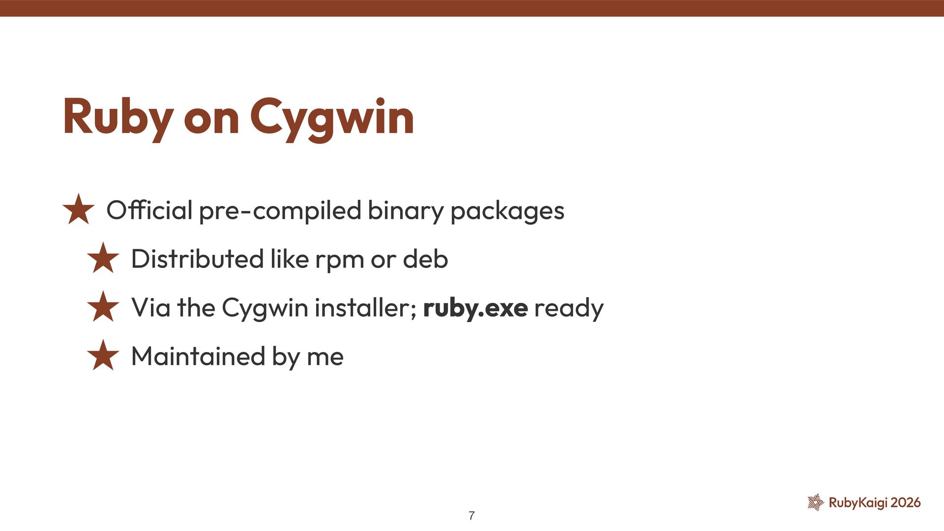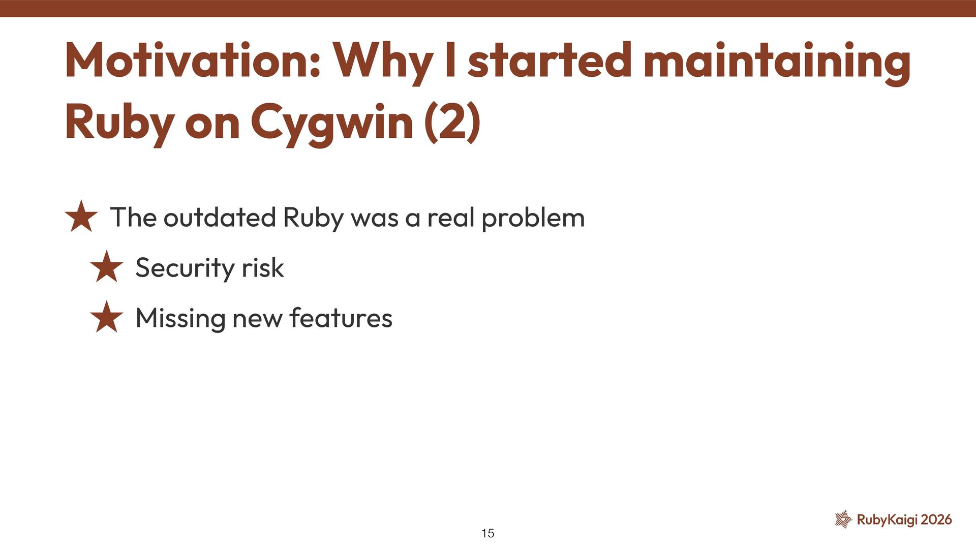 → package becomes orphaned ˒ Orphaned = no active maintainer ˒ Ruby went orphaned after 2.6 ˒ Ruby commi tt ers had no Cygwin maintainer either [1] The Orphaned Package 11 [1] h tt ps://github.com/ruby/ruby/blob/master/doc/maintainers.md