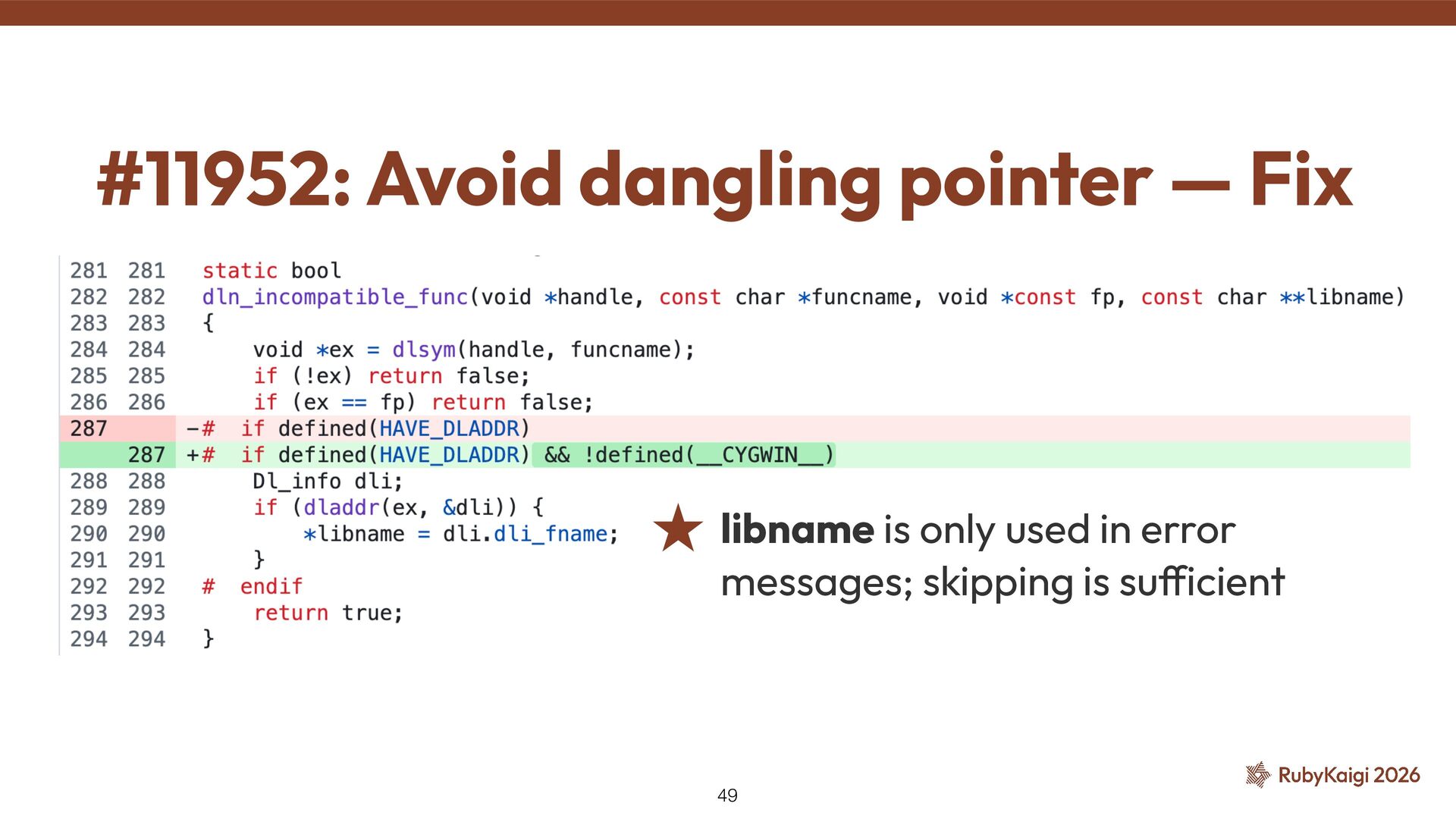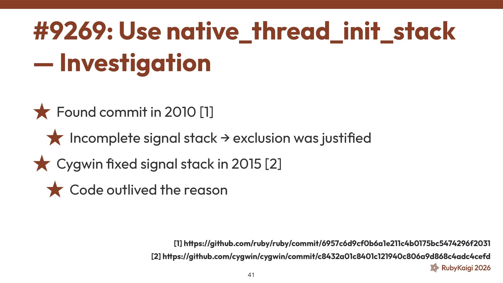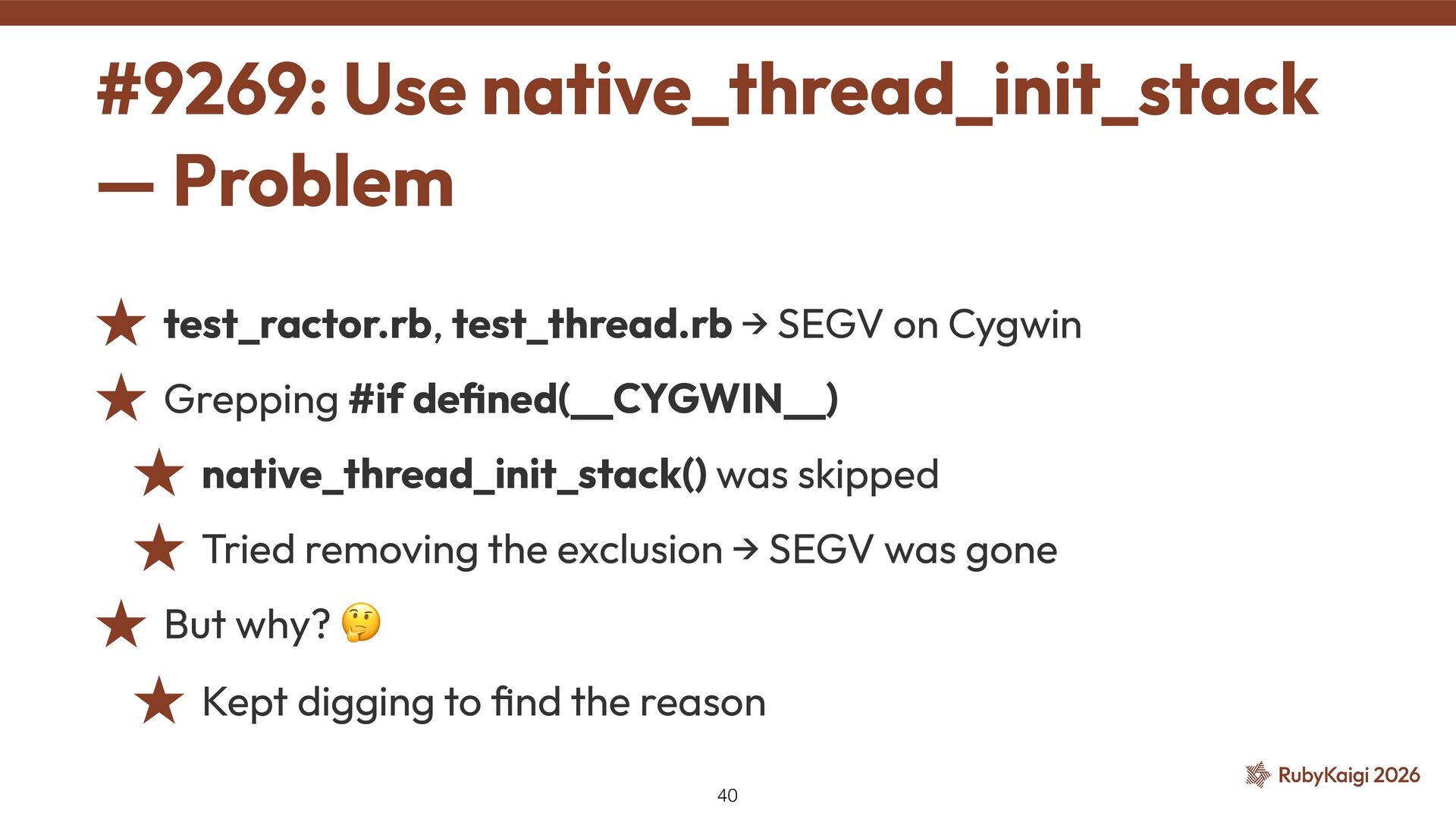 de fi ned(__CYGWIN__) ˒ native_thread_init_stack() was skipped ˒ Tried removing the exclusion → SEGV was gone ˒ But why? 🤔 ˒ Kept digging to fi nd the reason #9269: Use native_thread_init_stack — Problem 40
