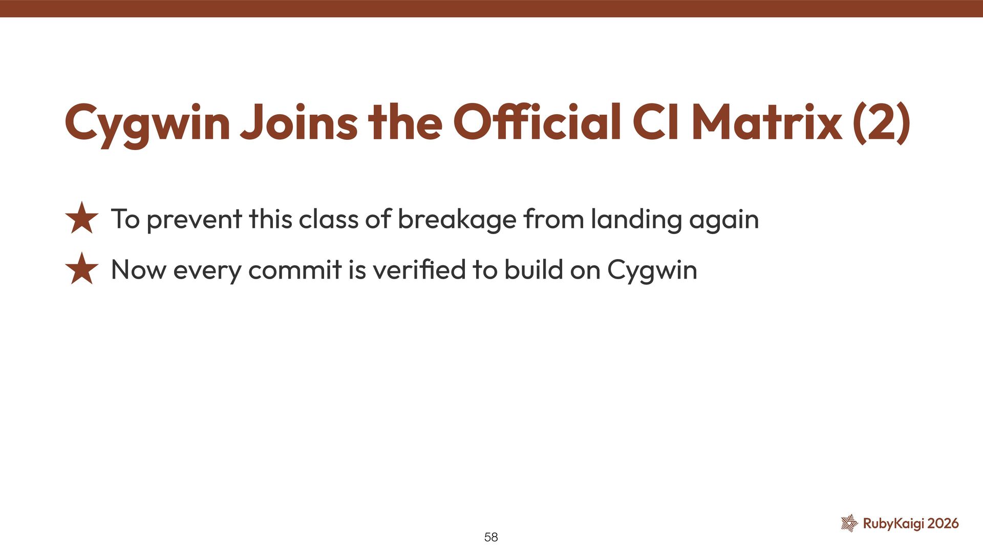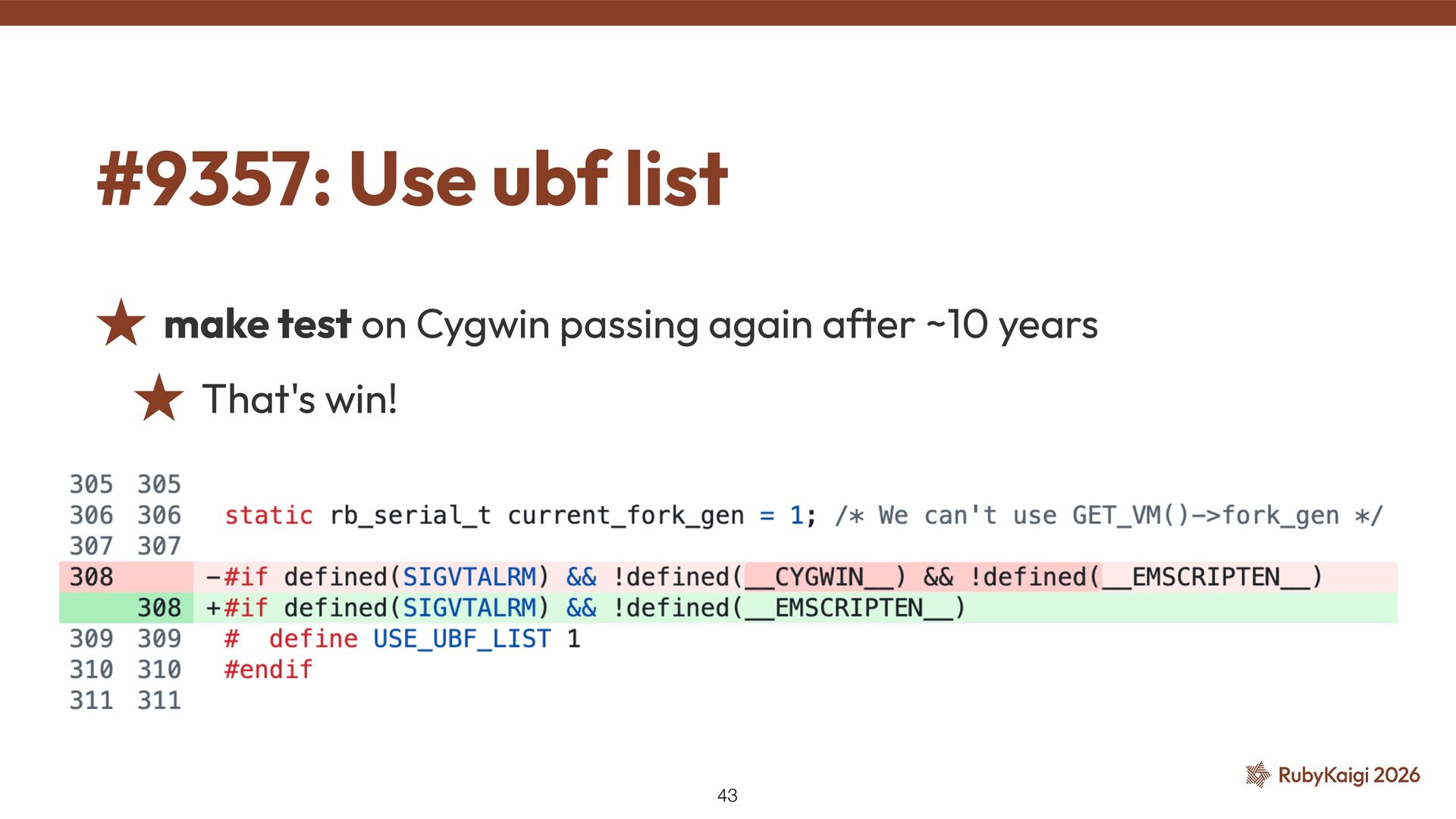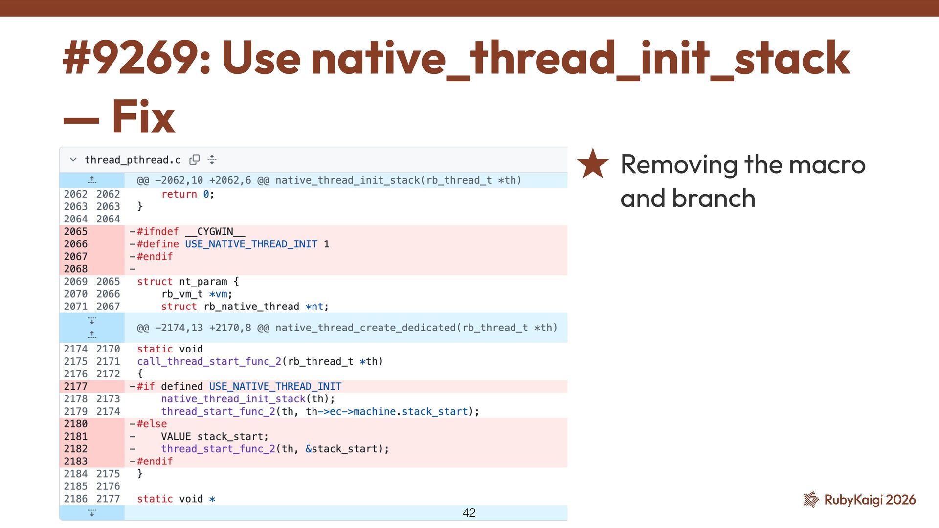 → exclusion was justi fi ed ˒ Cygwin fi xed signal stack in 2015 [2] ˒ Code outlived the reason #9269: Use native_thread_init_stack — Investigation 41 [1] h tt ps://github.com/ruby/ruby/commit/6957c6d9cf0b6a1e211c4b0175bc5474296f2031 [2] h tt ps://github.com/cygwin/cygwin/commit/c8432a01c8401c121940c806a9d868c4adc4cefd