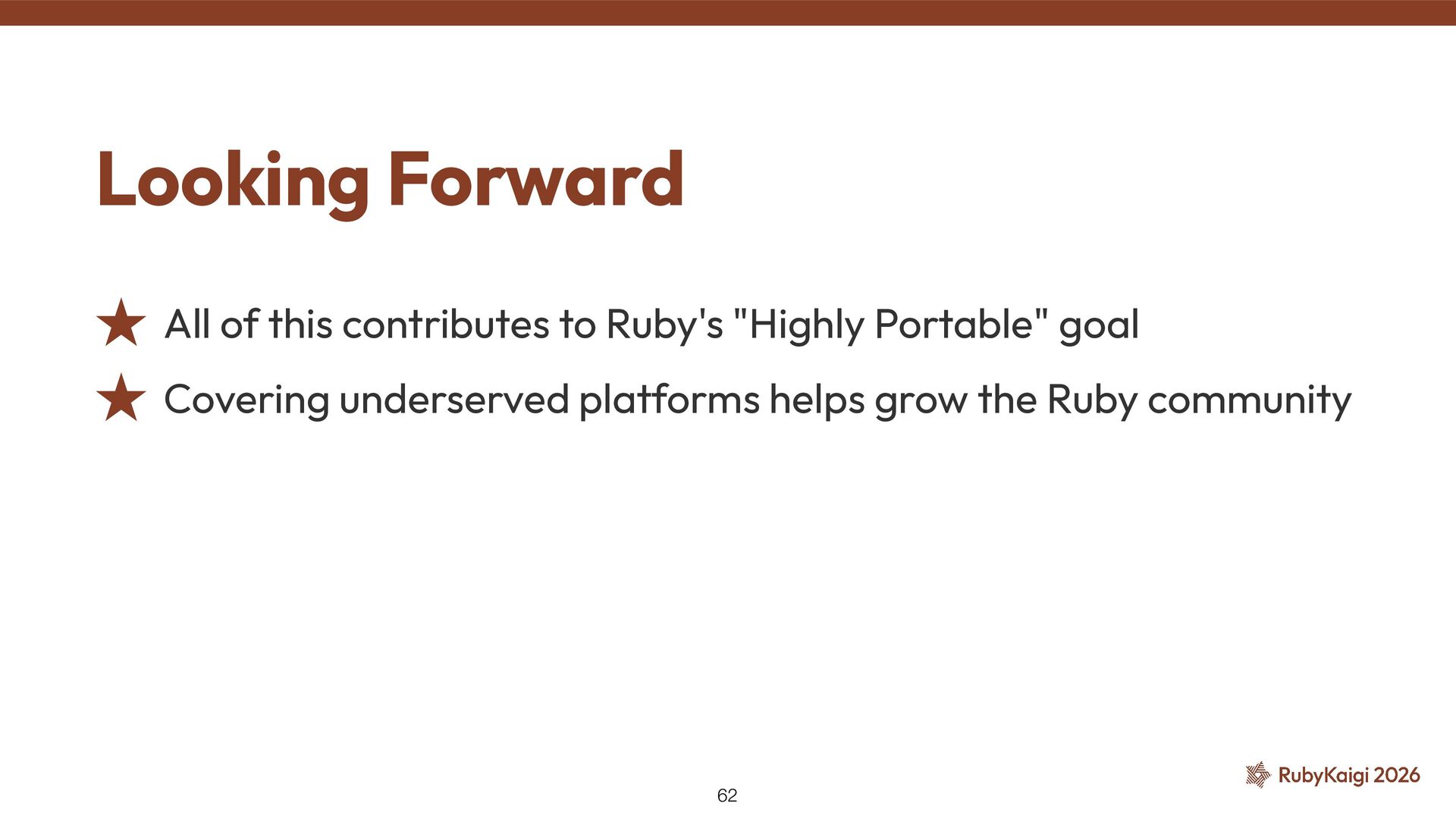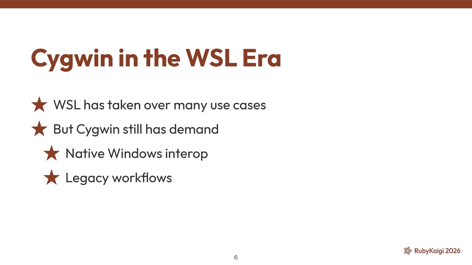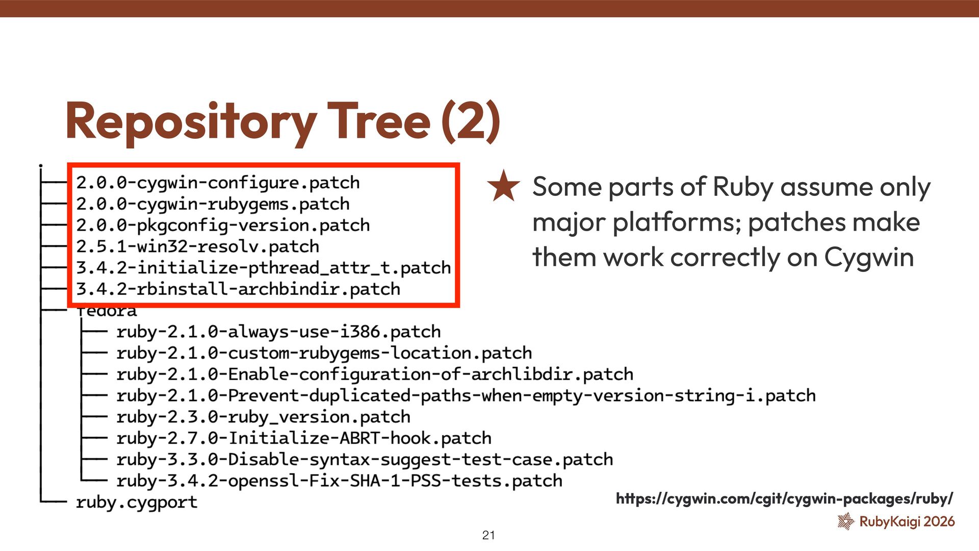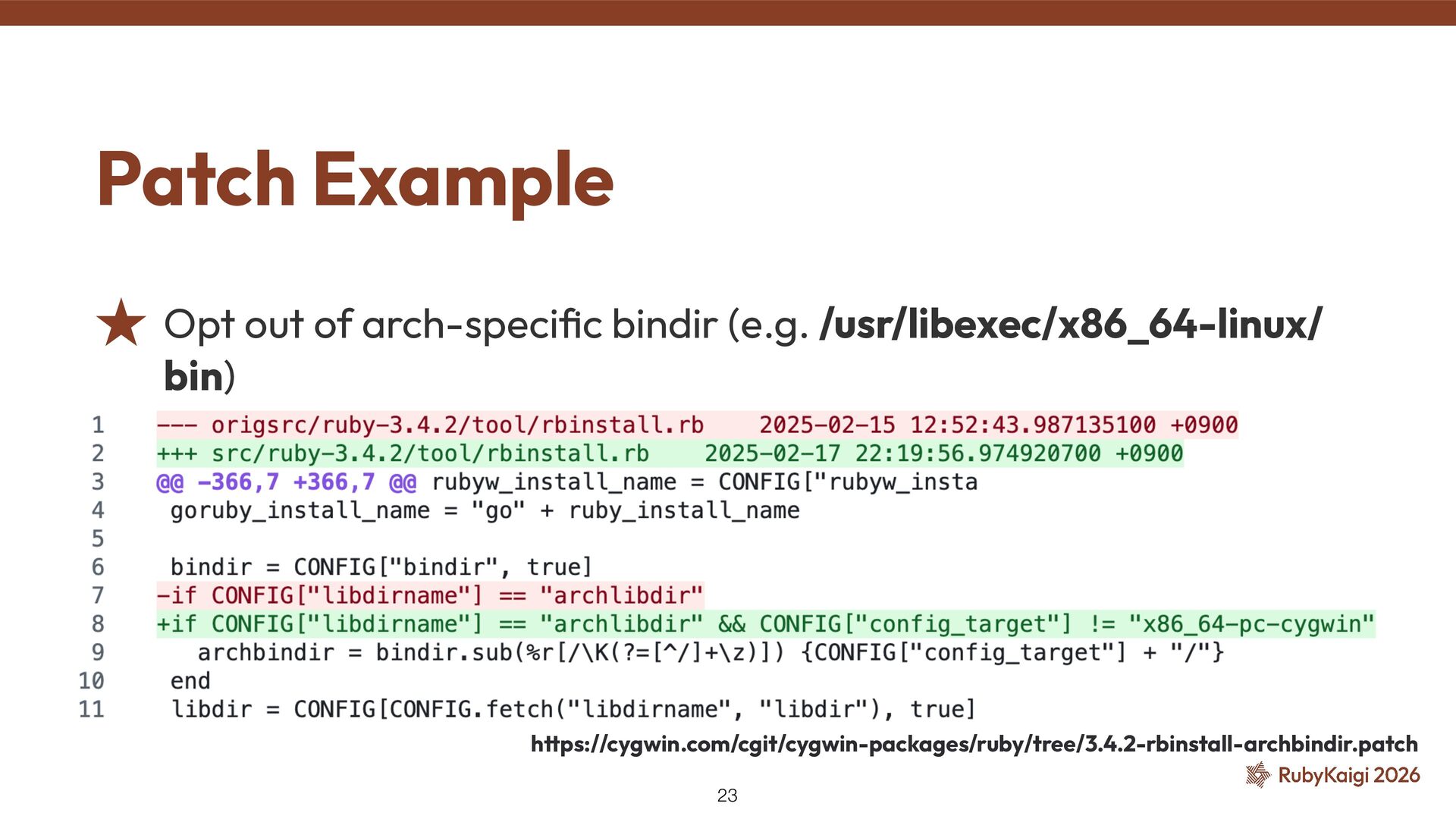 → exclusion was justi fi ed ˒ Cygwin fi xed signal stack in 2015 [2] ˒ Code outlived the reason #9269: Use native_thread_init_stack — Investigation 41 [1] h tt ps://github.com/ruby/ruby/commit/6957c6d9cf0b6a1e211c4b0175bc5474296f2031 [2] h tt ps://github.com/cygwin/cygwin/commit/c8432a01c8401c121940c806a9d868c4adc4cefd