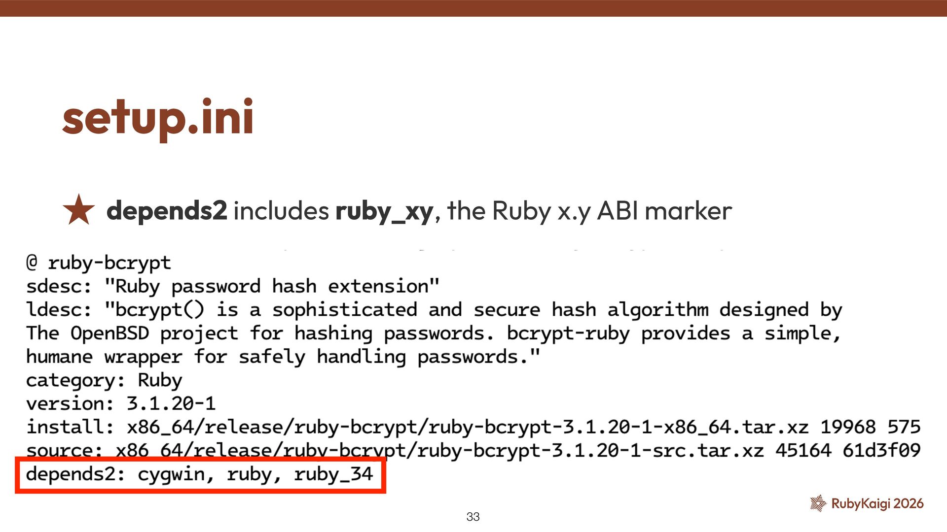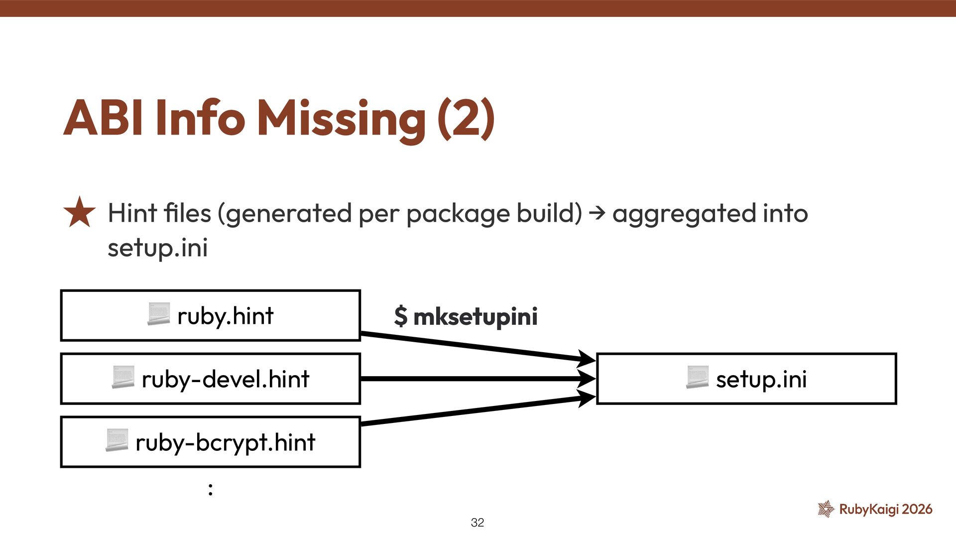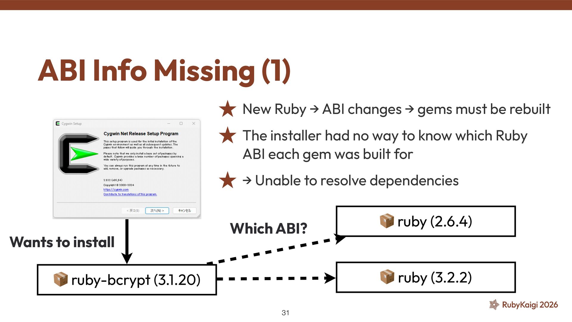📦 ruby (3.2.2) Wants to install Which ABI? ˒ New Ruby → ABI changes → gems must be rebuilt ˒ The installer had no way to know which Ruby ABI each gem was built for ˒ → Unable to resolve dependencies 31