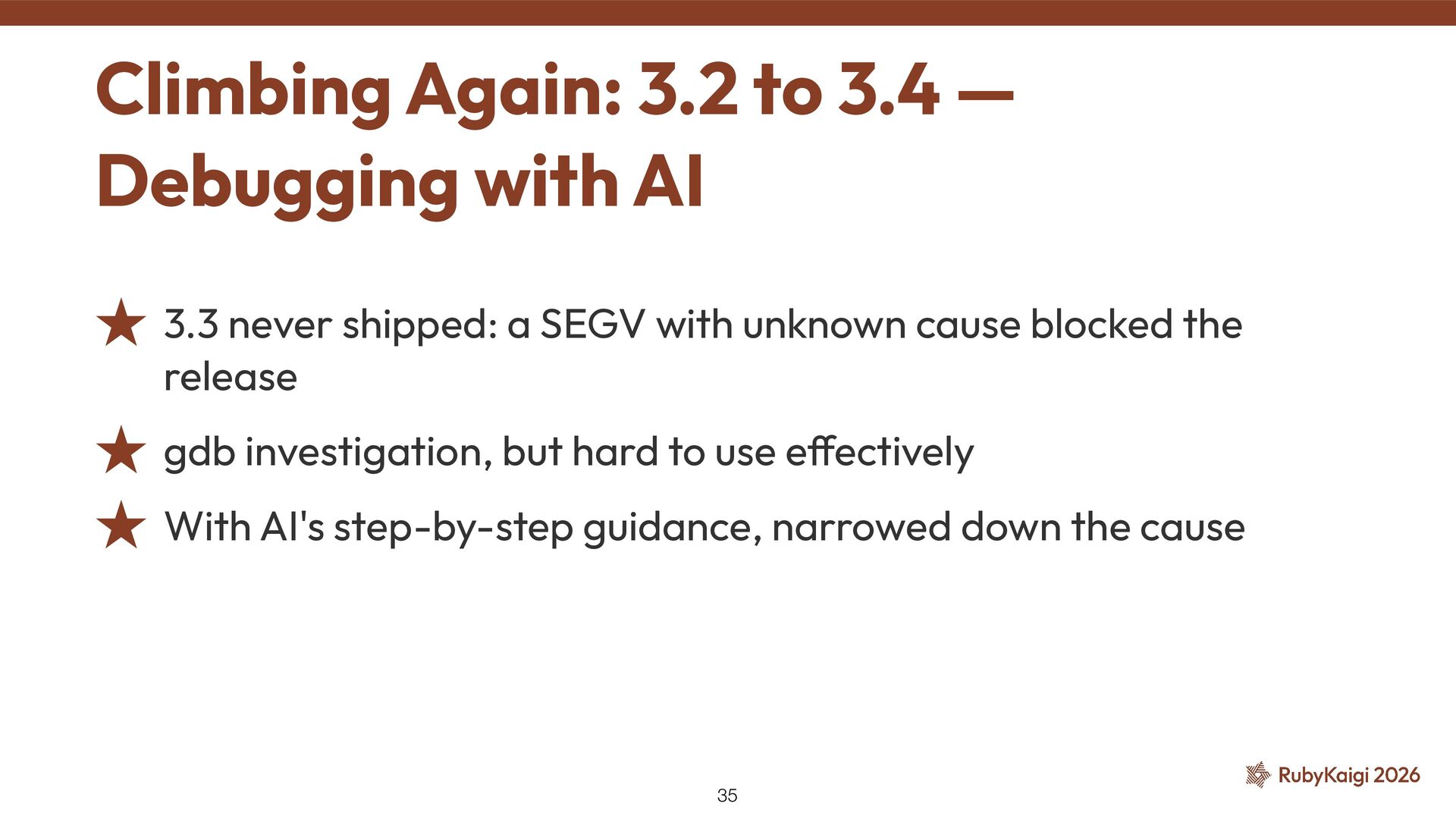 the release ˒ gdb investigation, but hard to use e ff ectively ˒ With AI's step-by-step guidance, narrowed down the cause Climbing Again: 3.2 to 3.4 — Debugging with AI 35