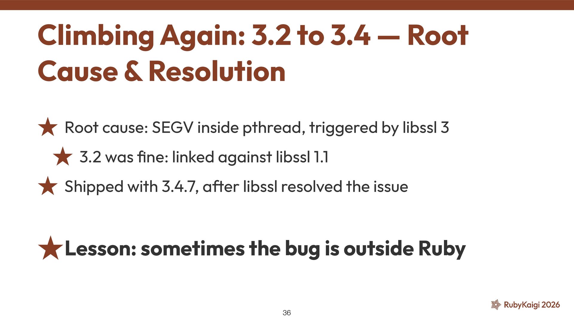 ˒ 3.2 was fi ne: linked against libssl 1.1 ˒ Shipped with 3.4.7, after libssl resolved the issue ˒Lesson: sometimes the bug is outside Ruby Climbing Again: 3.2 to 3.4 — Root Cause & Resolution 36