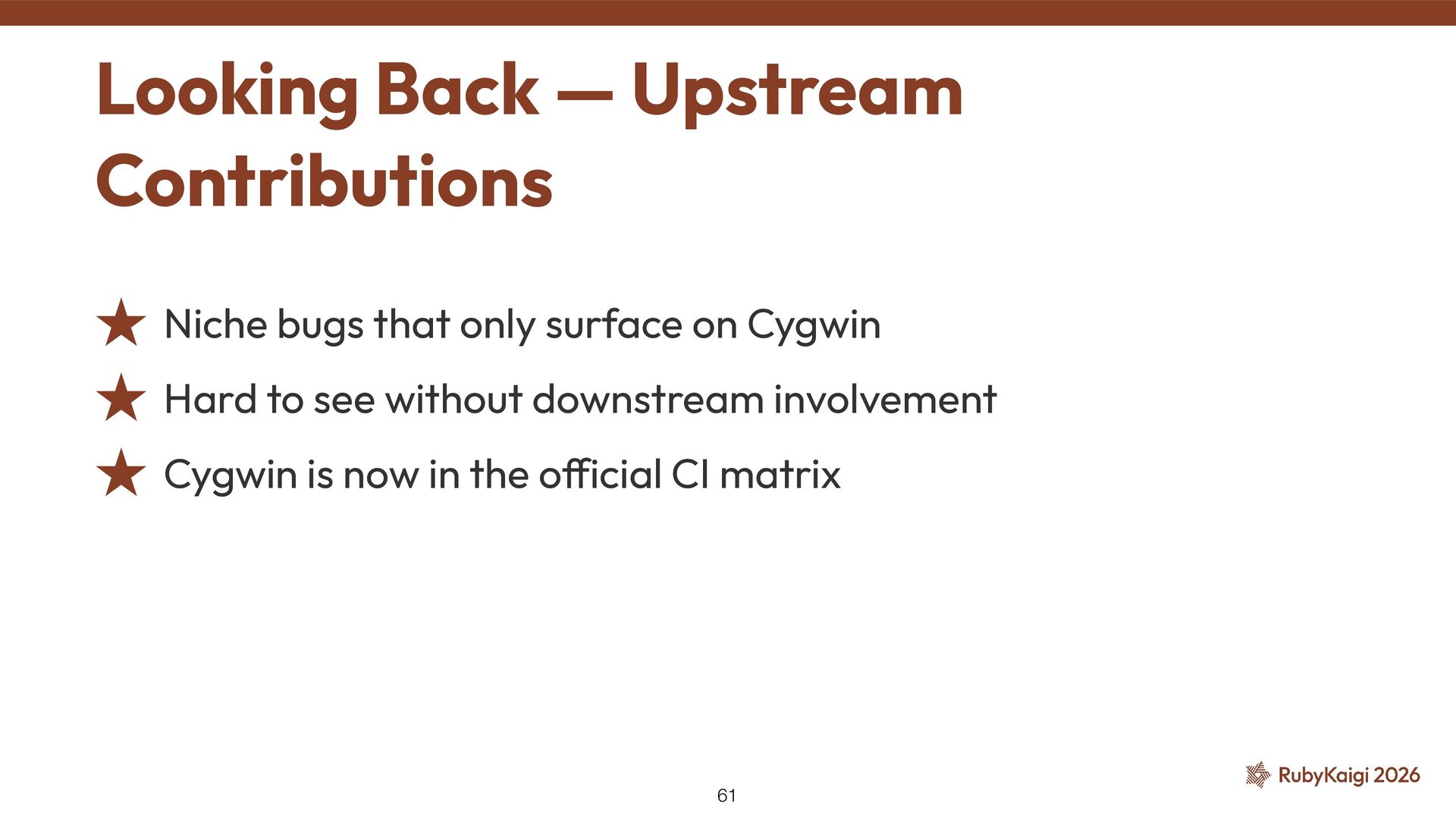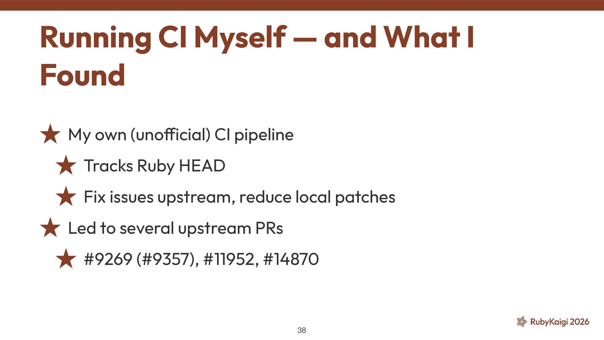 Ruby HEAD ˒ Fix issues upstream, reduce local patches ˒ Led to several upstream PRs ˒ #9269 (#9357), #11952, #14870 Running CI Myself — and What I Found 38